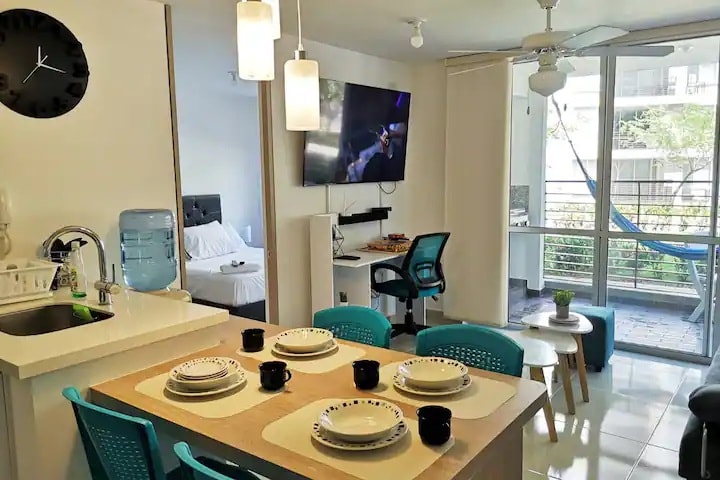Magnifico apartamento con espectacular vista, completamente dotado. Dos habitaciones cada una con aire acondicionado. Wifi, Smart TV en sala y habitaciónes con las aplicaciones de Streaming (Ingresar con sus propias cuentas debido a las políticas de las plataformas), BBQ gas natural en balcón, hamaca. Conjunto con jacuzzi, piscinas, tenis de mesa, billar pool, futbolín, gimnasio. Complejo deportivo con canchas de tenis, futbol 5, cancha múltiple, parque infantil e iglesias
