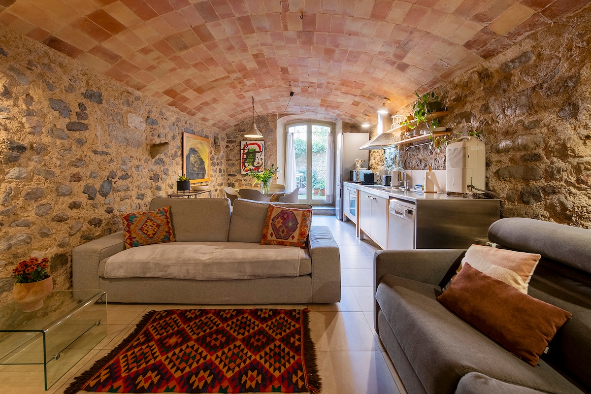 This beautiful duplex has been completely renovated with modern kitchen and a cute little patio and kept it’s eye for detail. The old stone walls, high rounded ceilings give you the feeling you are in the old town of Girona. One of the filming locations of Game of Thrones is just around the corner. A perfect place to call home for a few days and enjoy the old city of Girona.