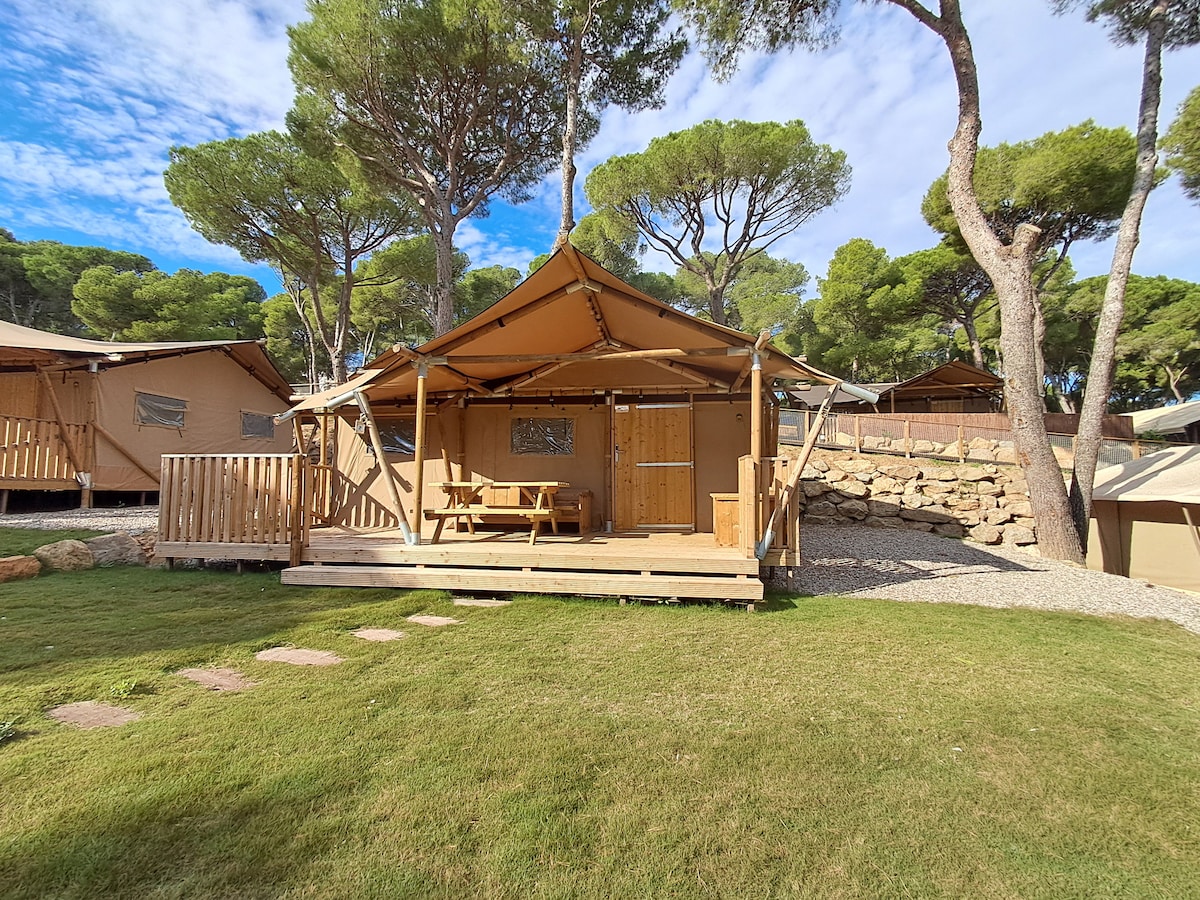 Tiendas glamping situadas en la parte media-alta del resort. Capacidad para 4 personas. Disponen de dos dormitorios, uno con cama de matrimonio (150x200) y otro con litera de camas individuales (80x200); cocina equipada. Terraza cubierta con sofá y mesa de madera para pícnic. No dispone de baño pero sí de agua corriente, deben utilizarse los baños y duchas de la zona común de acampada. Sábanas y toallas no incluidas (ofrecemos servicio de alquiler). No se aceptan mascotas.
