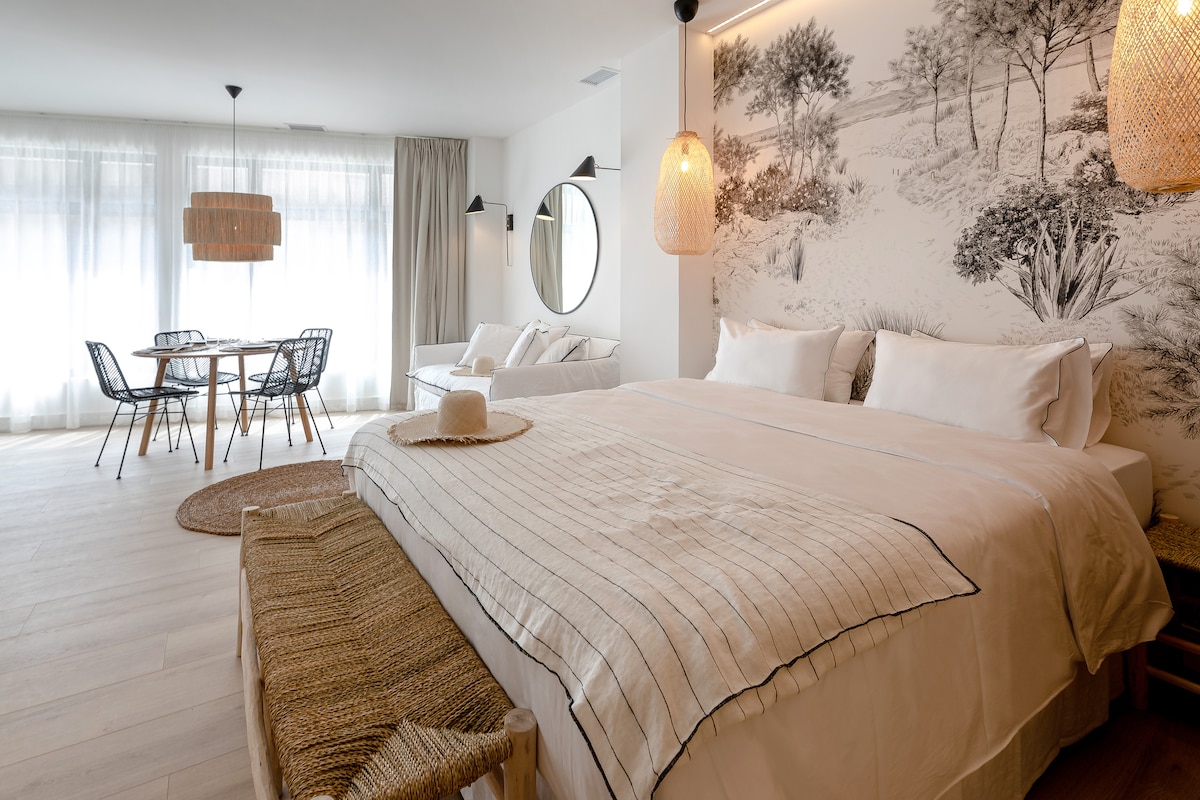 ¡Enamórate de nuevo en nuestro loft vista mar! Podrás ver el mar desde el balcón, mientras despiertas en tu cama o mientras te duchas. Decorado con esmero y con todo lo necesario para que solo os preocupéis el uno del otro. Bamblue Boutique Apartments se encuentra a 500m de la playa, con wifi de alta velocidad, smart TV con chromecast, aire acondicionado, lavavajillas,... Disfruta de tu balcón y las zones comunes: piscina, barbacoa, terraza, solarium,... Tenemos parking (€) bajo reserva previa.
