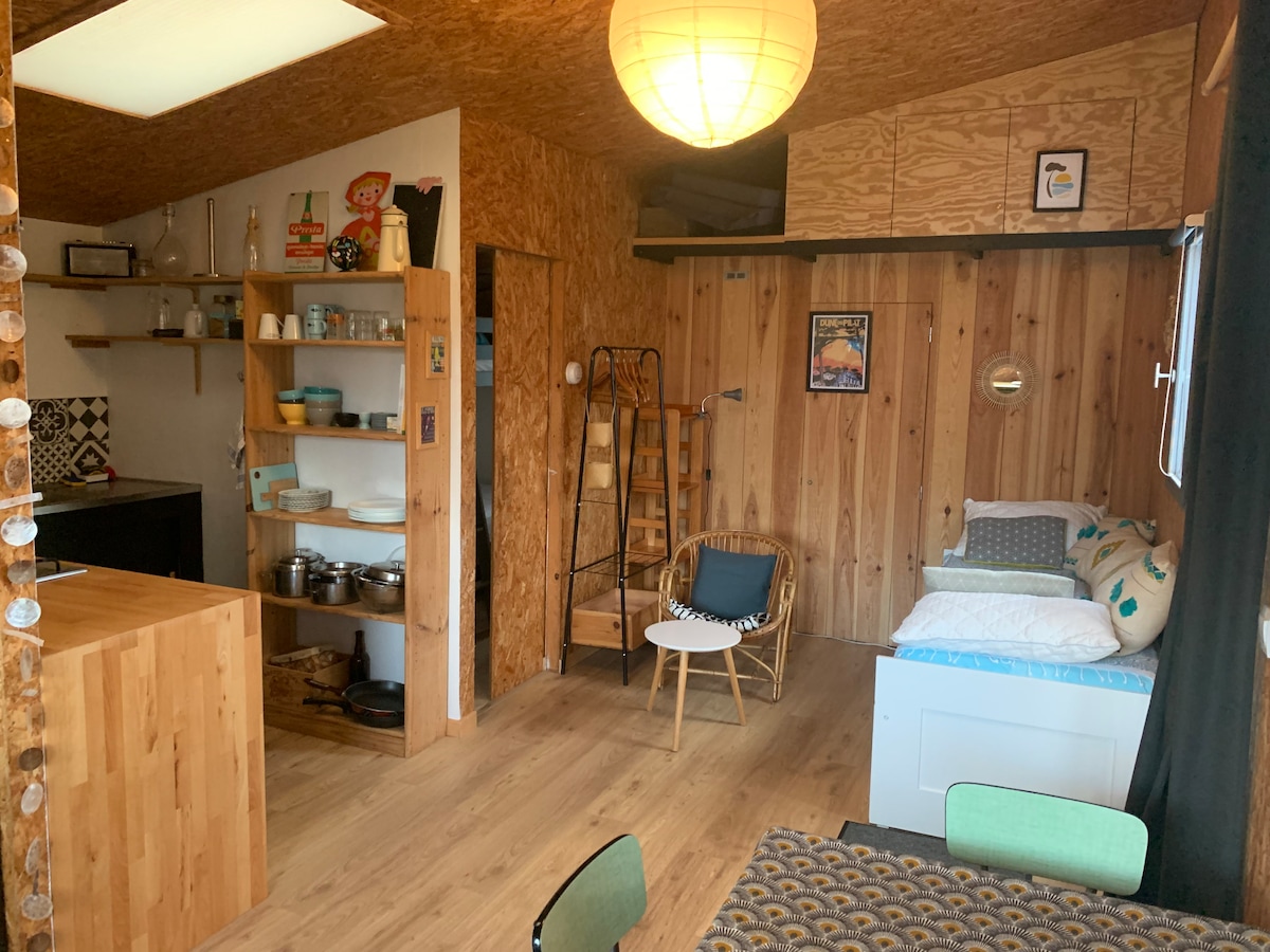 La petite cabane en bois est un logement indépendant de 32 m2 donnant sur un jardin privé à l'ombre des chênes. Située sur le terrain des propriétaires, elle comporte un séjour avec une banquette convertible en lit (160 X 200) et une petite chambre avec 2 lits superposés (90 X 180). Le jardin dispose de différents endroits pour profiter de l'ombre ou du soleil. Proche du centre bourg, la piste cyclable est rapidement accessible. A 10 km de Lège Cap ferret et de Lacanau, la plage est à 8 km.