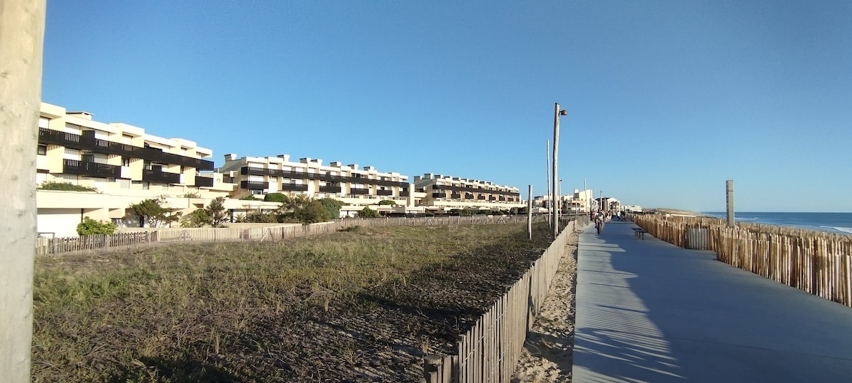 Appartement en duplex de 43m2 avec mezzanine. Grand lit double sur celle-ci. Deux lits superposés simples dans l’entrée, comme dans les stations de ski. Possibilité d'un matelas dans le salon ou dans la mezzanine. lit parapluie et chaise haute dispos(sur demande). Pièce à vivre agréable avec une grande baie vitrée, vue imprenable, plein ouest, sur l'océan. Salle de bain avec douche (dans la baignoire) Coin cuisine (Four Micro Onde & Plaques électriques). Draps & serviettes sont fournis.
