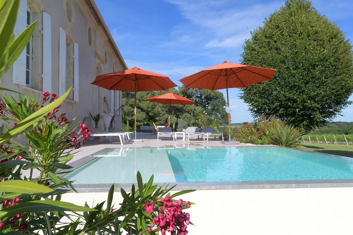Authentic girondin house, in the eart of Bordeaux Entre-deux-mers vignard, 35 km from Bordeaux and 24 km from Saint-Emilion medieval city. This 350 m2 house offers high quality services. You’ll can enjoy the large south terrace and the warmed infinity-edge swimming pool with outdoor shower. This more than one hectare property offers panoramic view on the vignard, with direct access to the 54 km long bike path from Bordeaux to Sauveterre de Guyenne by the private wood.