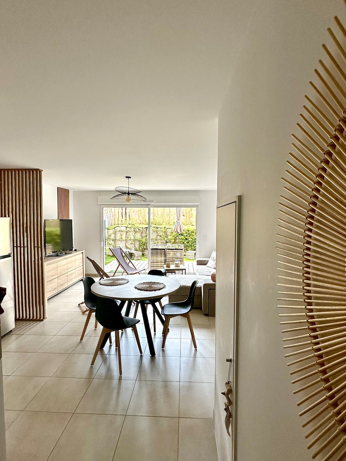 Situation idéale entre Arcachon et Cap-Ferret. Andernos Betey : à 100m du port et plages du bassin, 8 min à pied du centre ville... Accès direct piste cyclable, Biocoop et boulangerie à 200m Plages océanes 15km T2 situé dans la dépendance de notre propriété entourée de végétation. 21m2 + chambre en mezzanine : Petite cuisine équipée, coin repas, canapé, TV & barre son, s.d'eau avec wc fermé + douche extérieure chaude ! Terrasse couverte 30m2 côté sud, table et repos au milieu des bambous !!