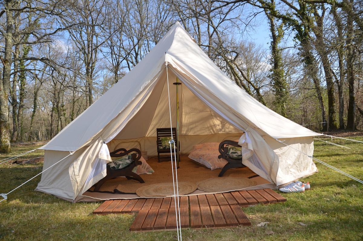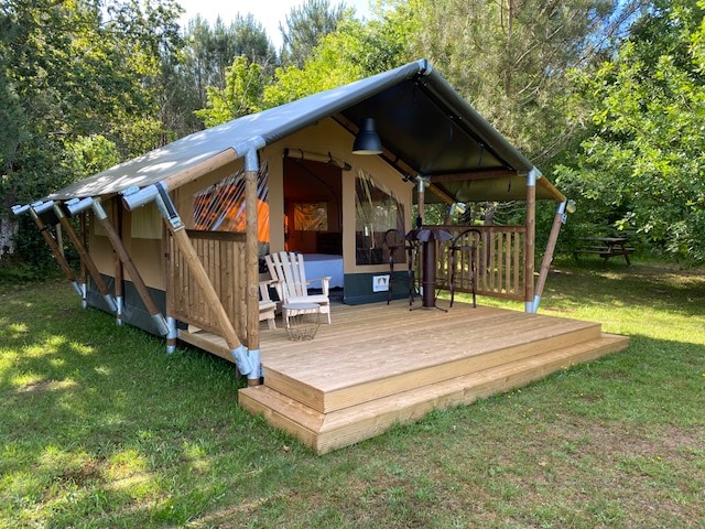 Au sein d'un petit camping chez l'habitant, cette tente équipée est unique, et dispose de son propre espace. Equipé d'une cuisine, de deux chambres avec lits confortables, et d'un salon, il a un auvent de 10 m2 et ses propres toilettes sèches. Equipé d'électricité, et l'eau potable est accessible à volonté par un robinet extérieur Vraie douche extérieure avec eau chaude, spacieuse et agréable. Le reste des équipements se partage avec quelques campeurs : espaces et vaisselle, abri. Endroit calme.