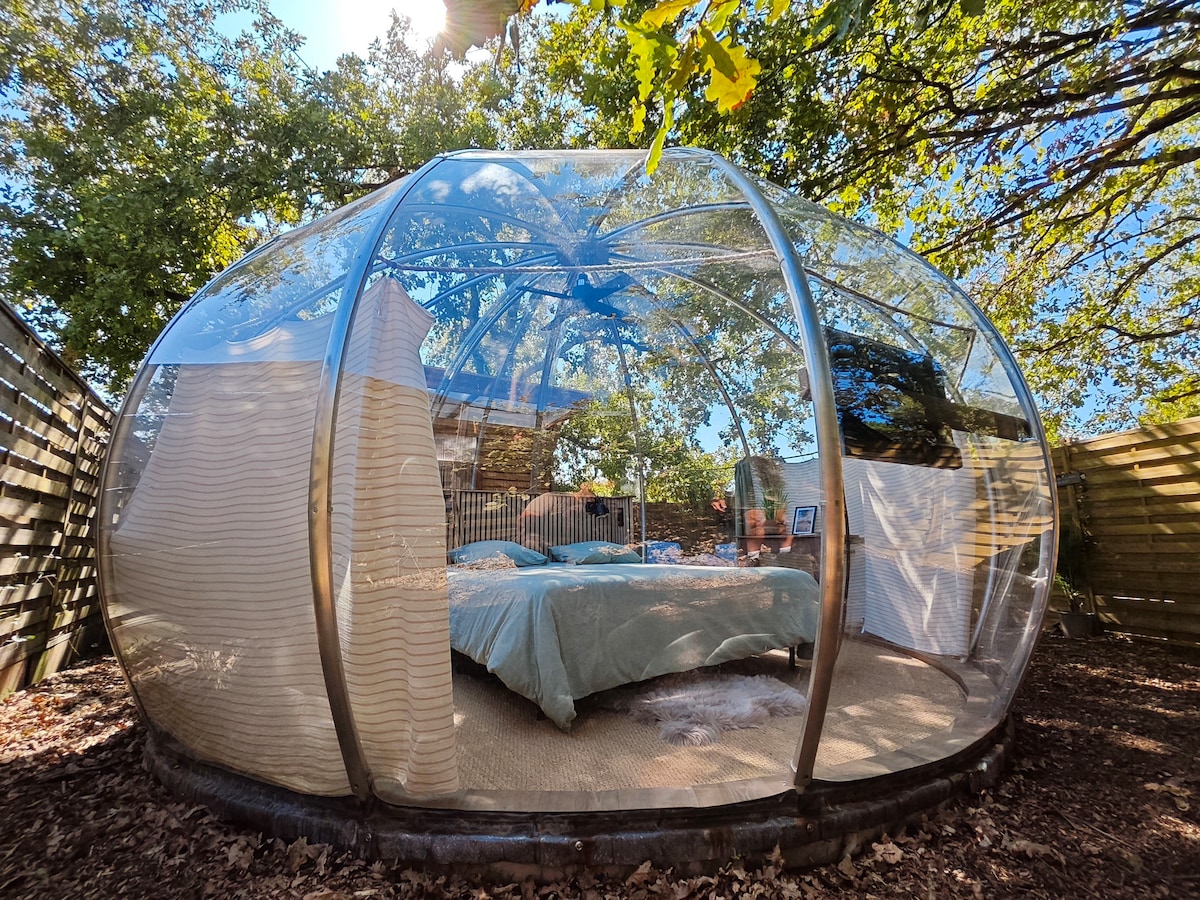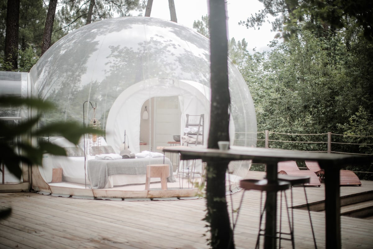 Nichée en entrée de forêt, notre Bulle écologique vous immerge directement au cœur de la nature, grâce à sa toile cristalline. Au petit matin, savourez un petit-déjeuner gourmand avec le chant des oiseaux. Pour votre confort, vous disposez d'une petite cabane avec salle de bain privée au pied de la Bulle. Durant votre séjour vous aurez accès à notre baignade naturelle. Idéal pour une parenthèse de nature à 50mn de Bordeaux