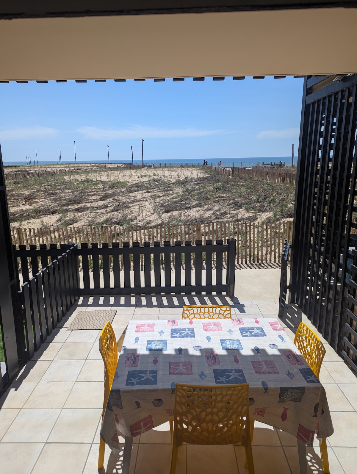 Appartement en duplex de 43m2 avec mezzanine. Grand lit double sur celle-ci. Deux lits superposés simples dans l’entrée, comme dans les stations de ski. Possibilité d'un matelas dans le salon ou dans la mezzanine. lit parapluie et chaise haute dispos(sur demande). Pièce à vivre agréable avec une grande baie vitrée, vue imprenable, plein ouest, sur l'océan. Salle de bain avec douche (dans la baignoire) Coin cuisine (Four Micro Onde & Plaques électriques). Draps & serviettes sont fournis.