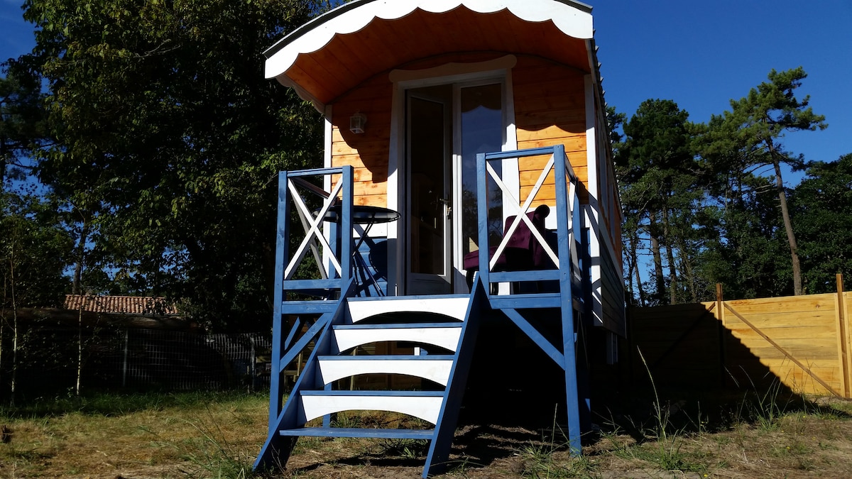 Roulotte de plage (17m² habitable sur parcelle de 100m²) située tout prés de l'Océan moins de 5mn à pied... La roulotte est prevue pour trois personnes avec un grand lit et un lit simple pour un invité, elle est placée sur un espace naturel avec des arbres. Décoration très romantique, tout confort avec douche chaude, coin cuisine tout équipé, sanitaire, salon et balcon pour prendre un verre au retour de la plage. Roulotte très bien isolée avec chauffage si nécessaire.