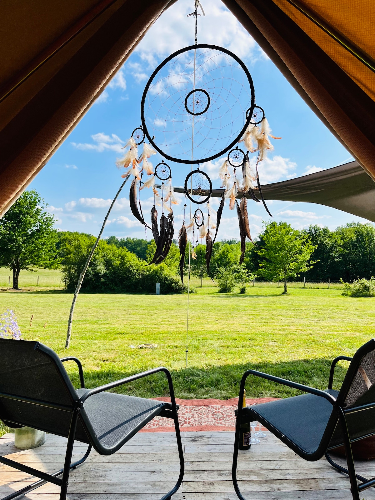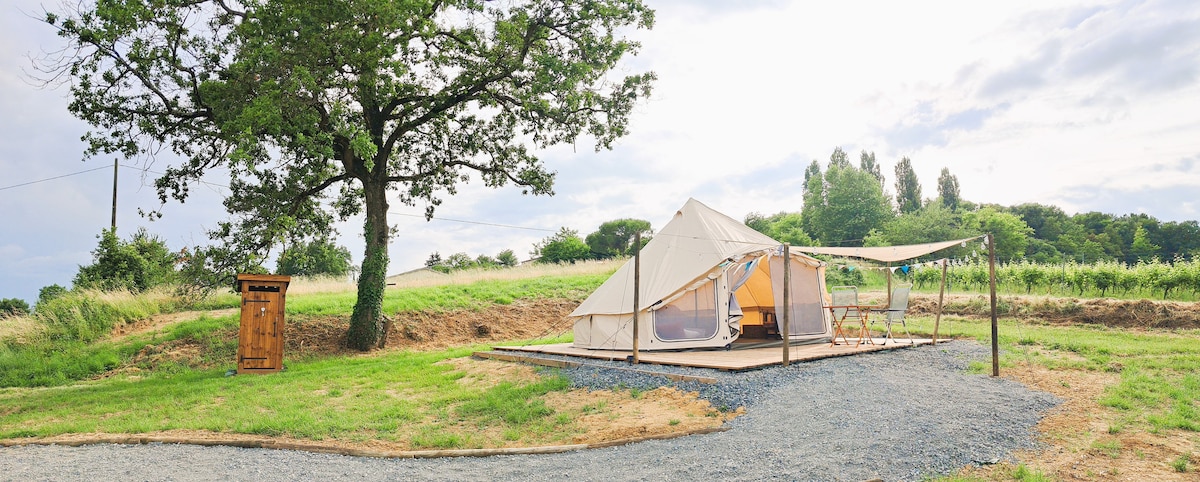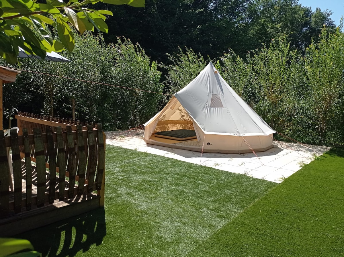 Au sein d'un petit camping chez l'habitant, cette tente équipée est unique, et dispose de son propre espace. Equipé d'une cuisine, de deux chambres avec lits confortables, et d'un salon, il a un auvent de 10 m2 et ses propres toilettes sèches. Equipé d'électricité, et l'eau potable est accessible à volonté par un robinet extérieur Vraie douche extérieure avec eau chaude, spacieuse et agréable. Le reste des équipements se partage avec quelques campeurs : espaces et vaisselle, abri. Endroit calme.