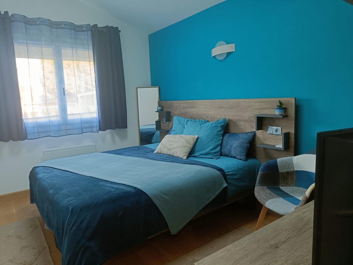 Logement dans un cadre verdoyant attenant à la résidence principale avec entrée indépendante, constitué d'un séjour avec un canapé et une télévision, une chambre séparée avec un lit double 160 x 200, une deuxième chambre lit double 160 x 200 une salle de bain avec douche et baignoire, 2 vasques et 1 WC. Draps et serviettes fournis Télévision HD connectée par antenne. La cuisine est équipée : micro-ondes -four-plaques induction- cafetière l'or et filtre Parking privatisé et sécurisé - wi-fi