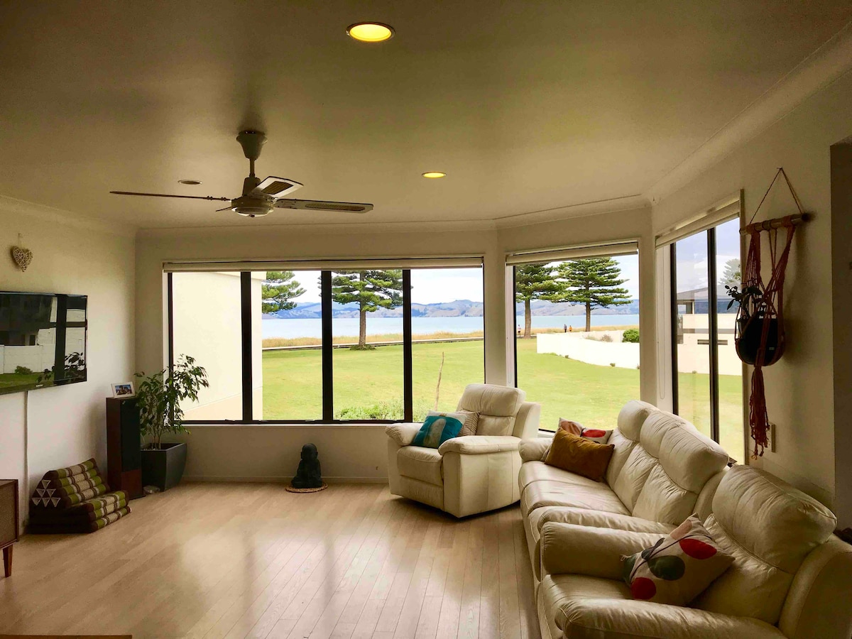 Beachfront Wainui Beach Gisborne. 8 mins to CBD. Stunning views, epic surf break, one of the last remaining true blue kiwi Baches on a huge double section. Wake up and literally check the surf from in bed. You won’t find a place closer or with better views than this one. It’s pretty special and full of character. The house is very comfortable with a Daikin Heat pump unit and oil heaters and fans in each bedroom. Off-street parking.