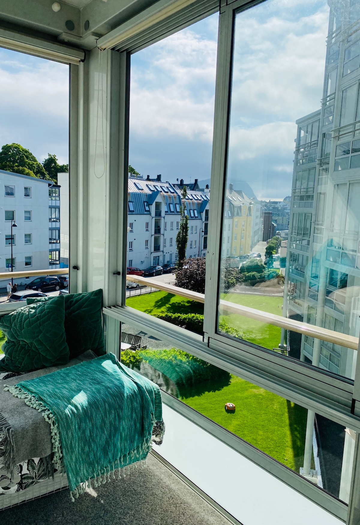 Just metres from the town centre, but very quiet at the end of a narrow road, with amazing fjord and mountain views! Your parking space is in front of our house, and you go down an exterior staircase to your entrance. The entry has a big wardrobe. Next is the modern and fully equipped kitchen. The bathroom has a shower and washer dryer combo. Down the hallway is a bedroom with a 150x200cm bed and a big closet, and a living room with a sofa bed that pulls out to 140x200cm and a crib. Welcome!