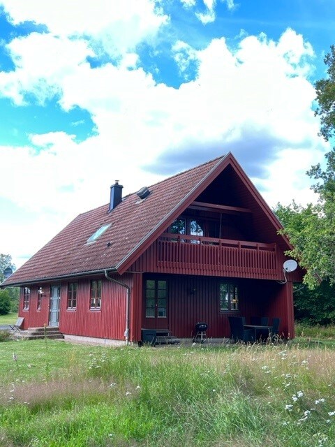 En fristående arkitektritad villa finns att hyra för kortare eller längre semestervistelse. Den ockrafärgade villan ligger på en alldeles egen avskild kulle i närheten av en liten by. Här är garanterat lugnt och fridfullt. Sommartid betar kor och får på ekhagarna framför huset, ett kulturlandskap med vildapel, oxel, ask och lönn. Ett stenkast bort finns en större bokskog, dammar och flera sjöar. Bakom huset breder en milsvid granskog ut sig. Det är ca 5 km till livsmedelsbutik och järnhandel.