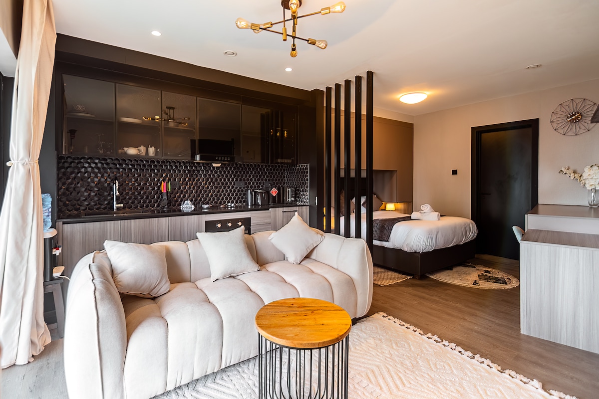 Opting for clean and uncluttered energy, you’ll find this apartment unit equipped for the most discerning guests. The living space displays minimalism with a tone style to complement contemporary decor with a hint of Japanese Wabi Sabi style. Colors are serene and neutral and comfort is the standard. Wall-to-wall glass facade windows flood the space with natural light (and warmth). Looking to take a siesta? Note : Gym and Pool is paid for guests that stay +30 days