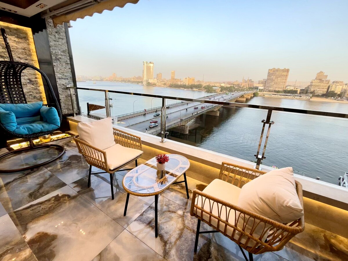 Nile.Dorra: Luxurious Boho-Style Experience elegance in this stunning three-bedroom, apartment in the heart of Cairo, overlooking the Nile. Enjoy breathtaking views of the river and pyramids from your balcony. The spacious living area features a lush island and a gourmet kitchen, perfect for entertaining. Each unique bathroom offers a spa-like experience, With natural wood and stone floors and walls, relax on the outdoor swing and embrace modern amenities. Book *Nile.Dorra* unforgettable stay