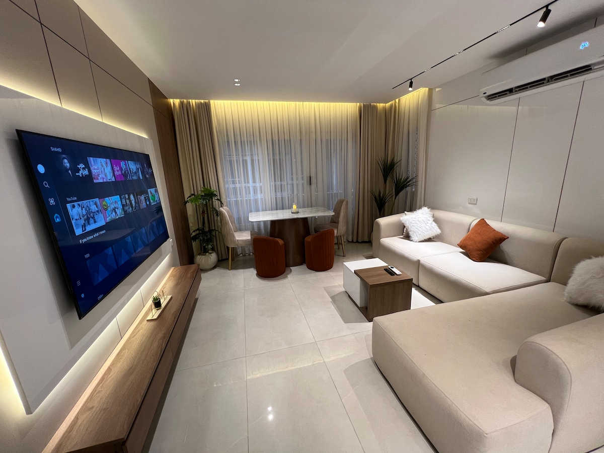 Welcome to our stunning apartment with an amazing pyramids view! Experience the awe-inspiring sight of one of the world's most iconic landmarks right from the comfort of your own living space. This beautifully designed apartment is strategically located to offer an uninterrupted panoramic view of the majestic pyramids. Immerse yourself in the breathtaking scenery as you relax in the spacious living area, complete with large windows that showcase the pyramid in all its glory.