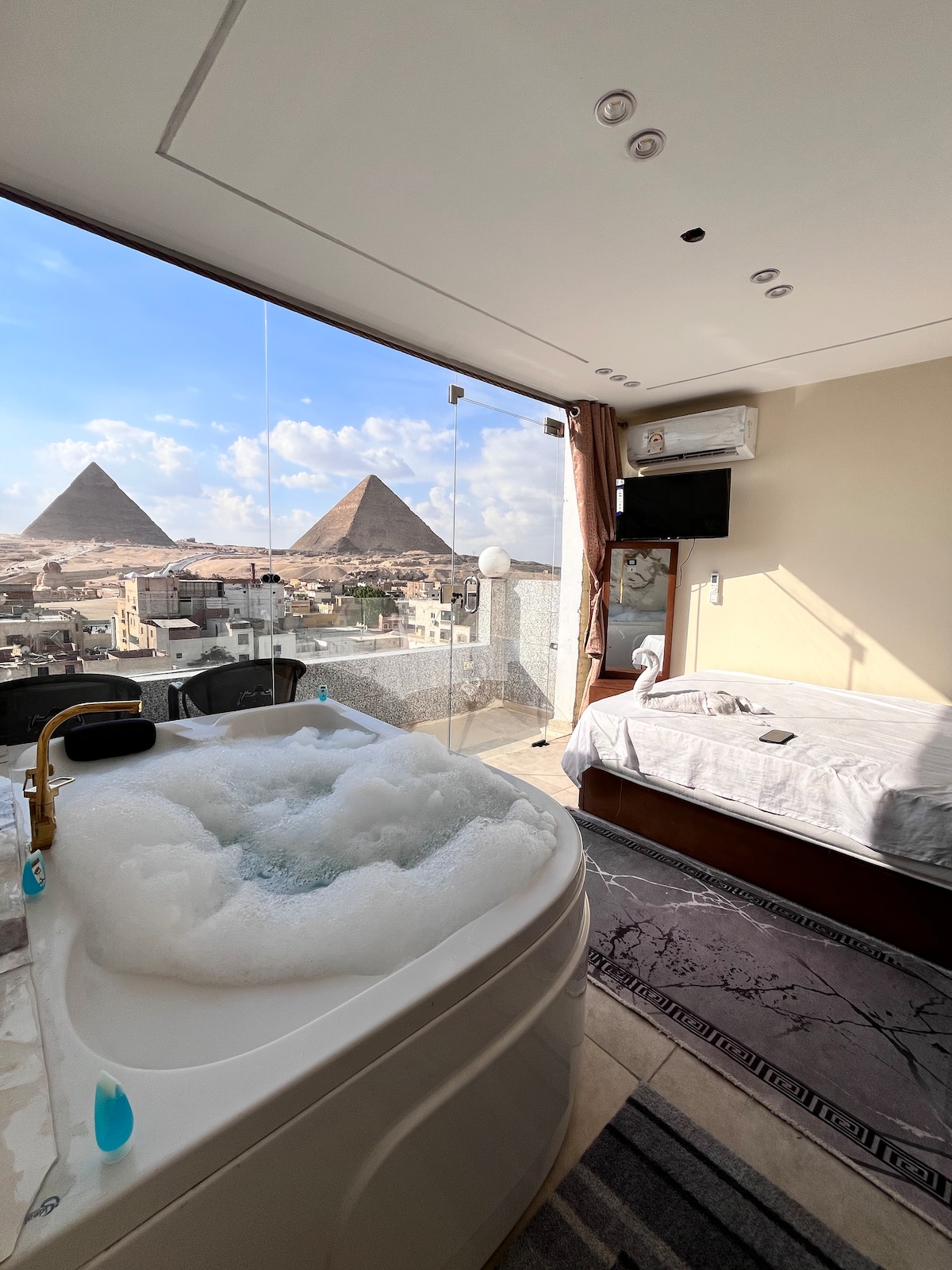 Our location is just cross from the Pyramids. We have a security person on duty 24 hours. Our apartments is located on the Fifth floor which will give you a higher overlook of the great Pyramids. DAY TOUR TO GIZA AND SAKKARRA IF YOU BOOK MORE THAN 4 NIGHTS OR FREE PICK IP FROM AIRPORT.