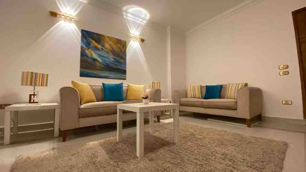 (Unmarried couples are not allowed, Experience comfort and style in this beautifully furnished modern apartment, designed to offer a relaxing stay. The space features contemporary décor, high-quality finishes, and everything you need for a seamless stay. close to French International School Carfoure, from Hub 50 Mall. 5 min to ring road, Mehour El Kafrawy reach soon to any location in Cairo to in Downtown district Five and Autostorad road. Close to Lycee Francine, Privilege schools