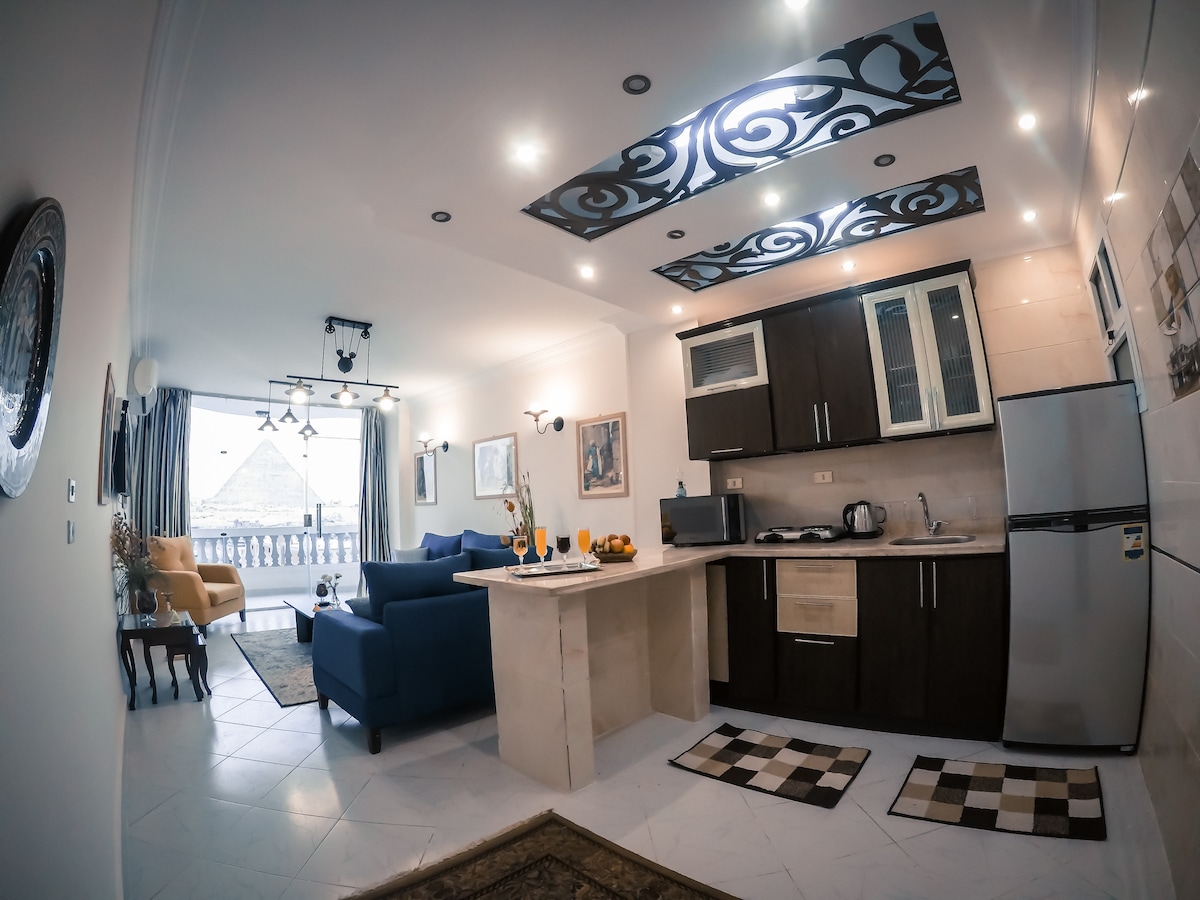 Legend Majestic Pyramids View Apartment offers a breathtaking direct view of all three Pyramids of Giza from the reception area. The apartment features three spacious bedrooms, a fully equipped kitchen, and a modern full bathroom, providing comfort, privacy, and elegance for families or groups. Designed for guests who want the best panoramic pyramids view, this apartment combines space, luxury, and an unforgettable location.