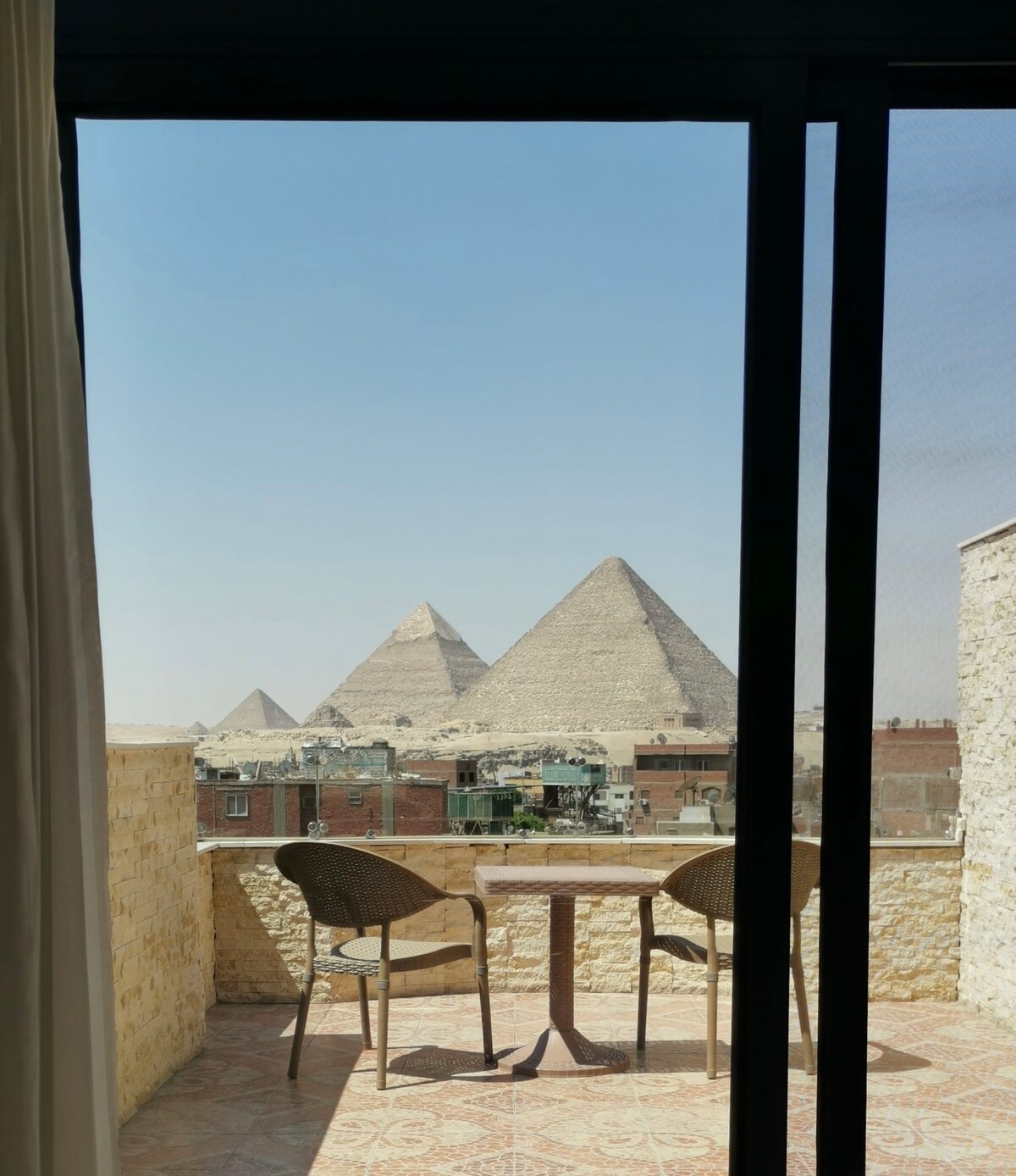 This apartment is located at only 5 min by walk from the Sphinx and Pyramids entrance gate with view of the pyramids from balcony , are in a quiet location close to many restaurants, shops, fruit shops, mall shop (local and touristic), mini markets, and pharmacies, Apartment is air conditioned, unlimited fast internet , Full accessories clean sheets, fresh towels & quite atmosphere. Its probably the best place to enjoy pyramids view