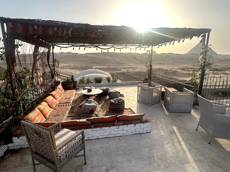Welcome to a one-of-a-kind retreat just 5 minutes from the Pyramids! This studio offers panoramic Pyramid views and a private hot tub. The space features Pharaonic-inspired design, with unique decor and architectural details that create a historic, cozy ambiance. Enjoy a queen bed, dining area, kitchenette, and private bathroom. Guests also have access to the shared rooftop with stunning views for an unforgettable stay.
