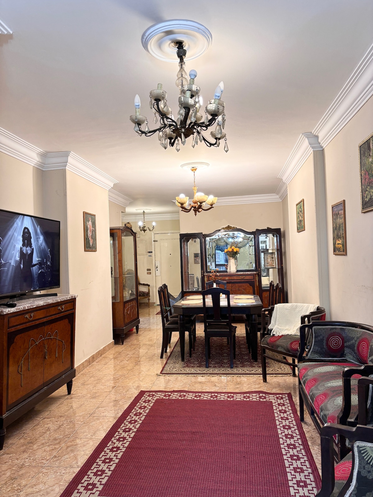 Welcome to our Nileview loft, Your charming home in the heart of Zamalek, Cairo's most central, safe, and vibrant hub. The stylish living room boasts a 55-inch curved smart TV and panoramic views on the Nile. A boho dining room with a bamboo swing overlooks a gorgeous Nile view. Two cozy Master bedrooms featuring noise canceling windows, memory foam mattresses, Egyptian cotton beddings, and a private bathroom in each room. Relax in comfort and style with a touch of bohemian charm by the Nile.