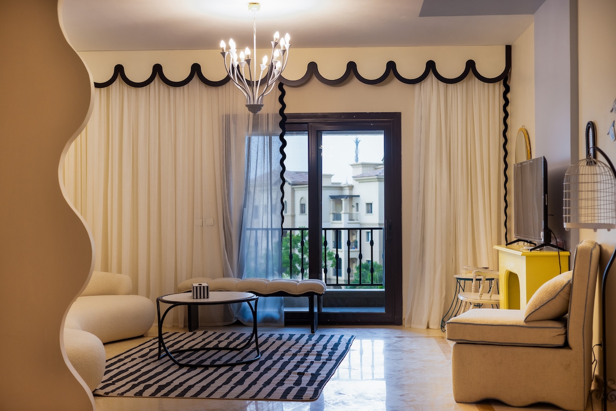 Step into a truly unique 2-bedroom neo-classic apartment with a private garden. Every detail is custom-designed, from the bold, colorful decor to the beautifully curated entrance, dining, and living areas. Enjoy a peaceful garden escape, perfect for relaxing or entertaining. Located in Sodic Villette compound right in the heart of golden square,New Cairo. this home offers comfort, style, and character like no other. A one-of-a-kind stay for guests who appreciate art, design, and individuality.
