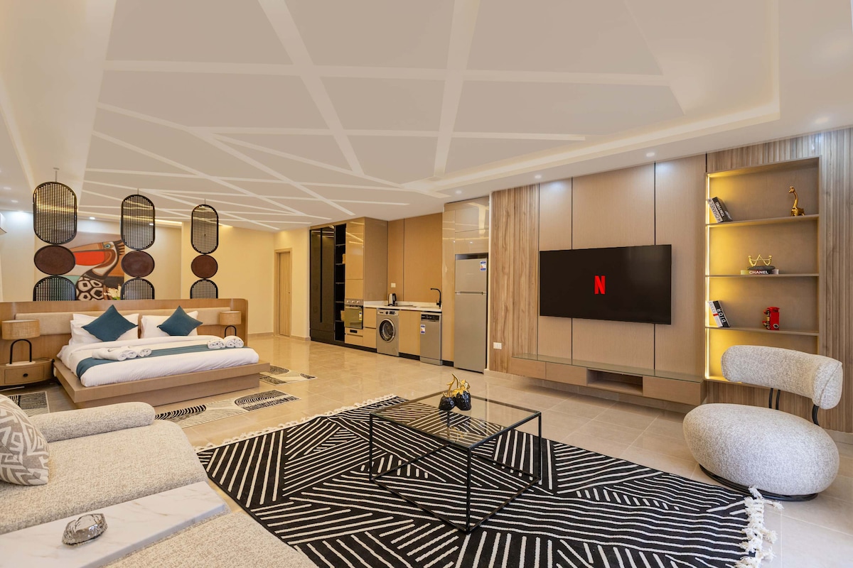 Notice: The shared **pool & gym are closed for maintenance until 30 April. We’ve priced accordingly. All other services (24/7 reception, security, Wi-Fi) are fully operational. A sleek, upscale studio apartment in New Cairo near AUC and EDNC, featuring a king-size bed and a comfortable living setup—perfect for couples, solo travelers, or business stays. Enjoy a luxury building with 24/7 reception and security, plus optional cleaning services for an additional fee.