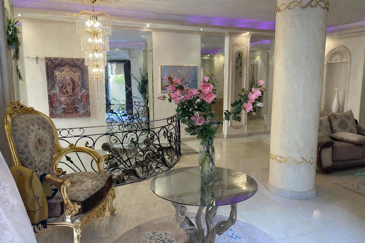 Reconnect with loved ones in this family-friendly place. It is a luxurious place overlooking the pyramids, the face of the Sphinx and the Grand Egyptian Museum. The place is distinguished by the services available around it, such as Orange Market, a pharmacy, a grocery store, a bakery, and a restaurant. It is distinguished by being close to the pyramids, where you can walk to reach it. This place can accommodate a family of 6.