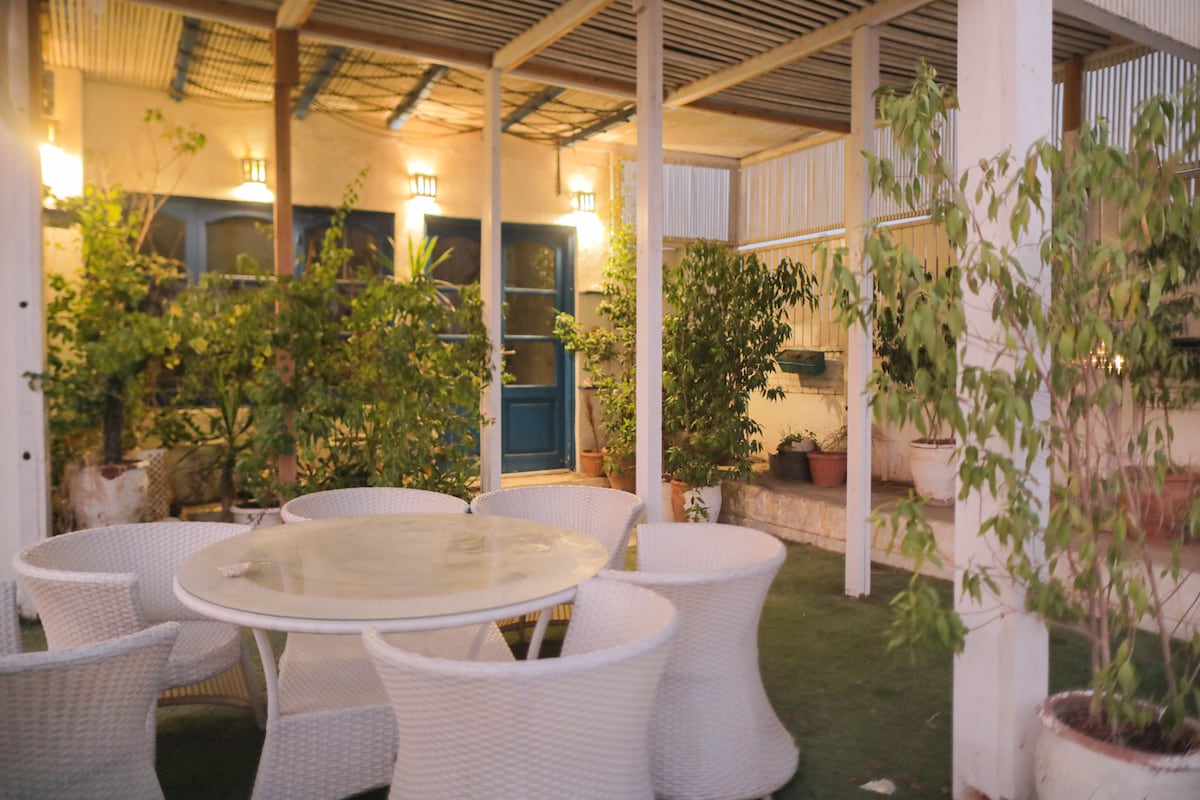 Wake up to the breathtaking view of the ancient Abusir pyramids right before you. Stunning 5-bedroom villa with guesthouse, pool, lush garden, gym, playroom & treehouse. Sleeps 10. Designed by award-winning architect Ahmad Hamid (2010 World Architecture Award), inspired by Hassan Fathy. 20 min to Giza Pyramids & Grand Egyptian Museum. Art collection personally curated by owner Taya Elzayadi. Private chef available for hire. A peaceful family-friendly retreat where history, art, and luxury meet.