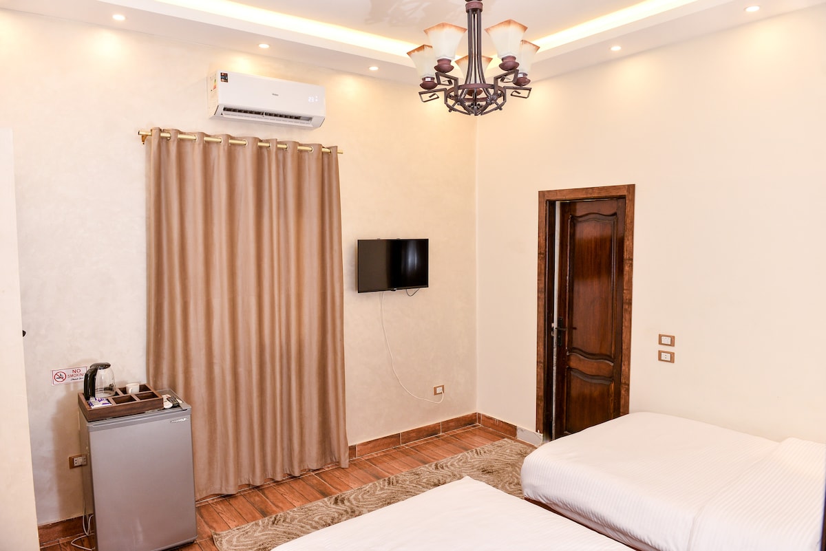 Large double room with a private balcony facing the Pyramids (4th floor). The room includes AC, a TV, fridge, kettle, as well as complimentary coffee, tea, and water (free iron upon request). The bathroom includes towels, a hair dryer, and complimentary shampoo, soap, and shower gel. The price includes homemade Egyptian breakfast prepared daily and served on the rooftop from 8 to 10 a.m.
