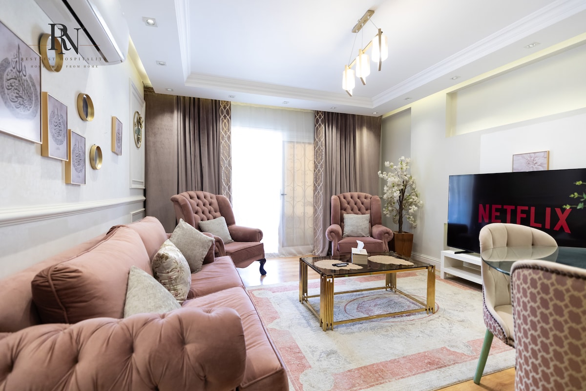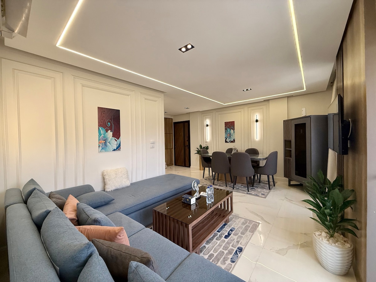 Luxuriate in a hotel-style stay at this luxurious smart apartment in Sheikh Zayed. Enjoy two elegant master suites with private bathrooms, a third room with a sofa bed, private jacuzzi, 65” Smart TV, sound system, smart lighting, central A/C, and keyless entry. Located in a quiet, upscale area near restaurants, malls, and hospitals. Perfect for families, youth, and business travelers seeking privacy, luxury, comfort, and a premium experience.