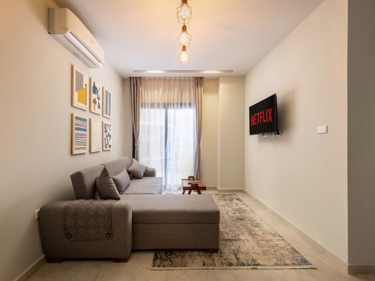 Welcome to our stylish 1-bedroom apartment: Message us for seasonal & special discounts. ●Bedroom (Queen size + sofa bed) ●Living room (smart tv + Couch) ●Dining area for 3 ●Sleek bathroom ●Fully equipped Kitchenette Located in the heart of the city, you'll be moments away from trendy cafés, vibrant nightlife, and top dining spots. ●WaterWay 5A, ●District 5 Marakez ●Uavenues ●The drive ●Katameya ●Garden 8 ●El Malahy ●CFC ●Arabella & many other venues. Contact us for more recommendations.