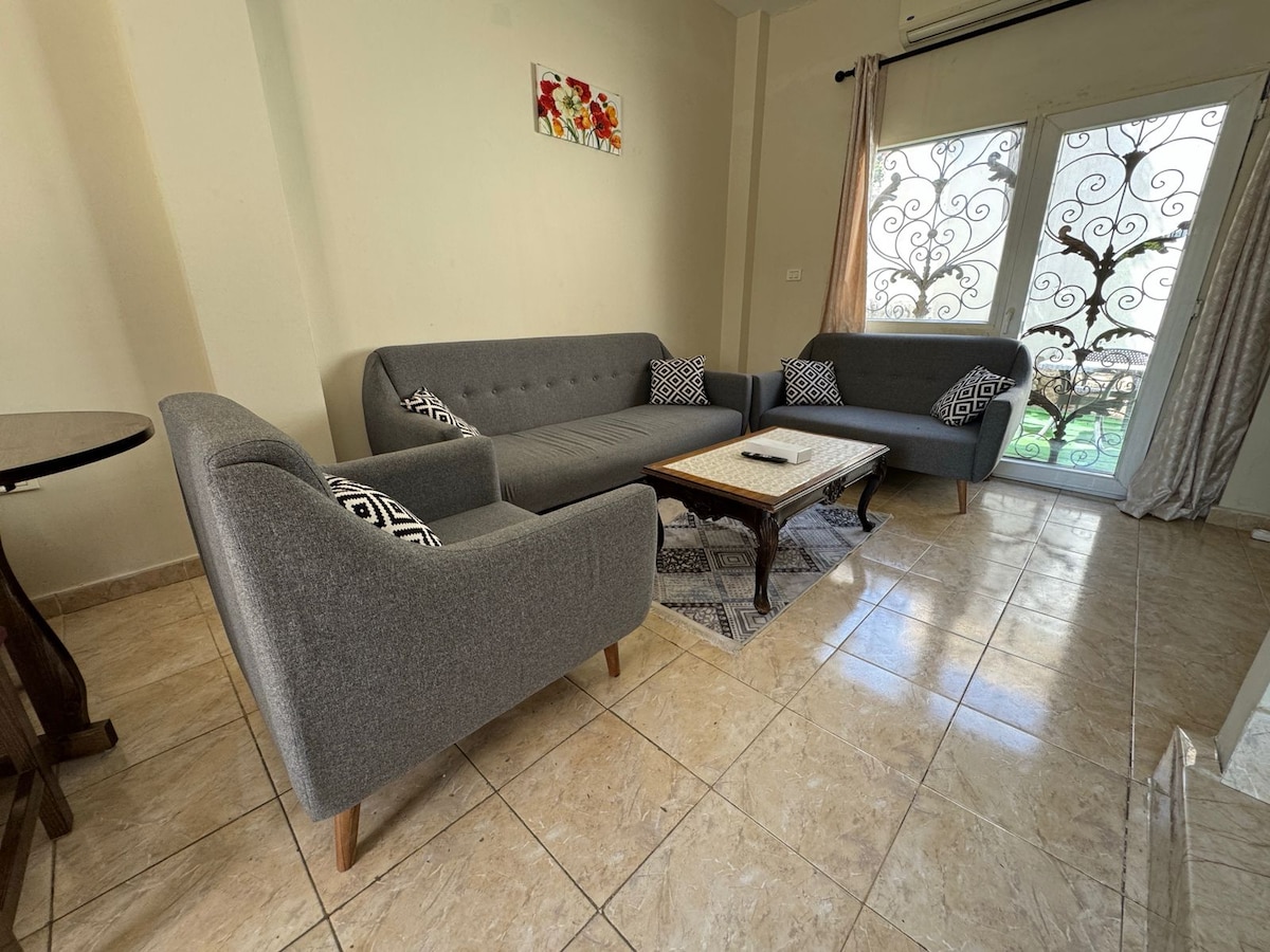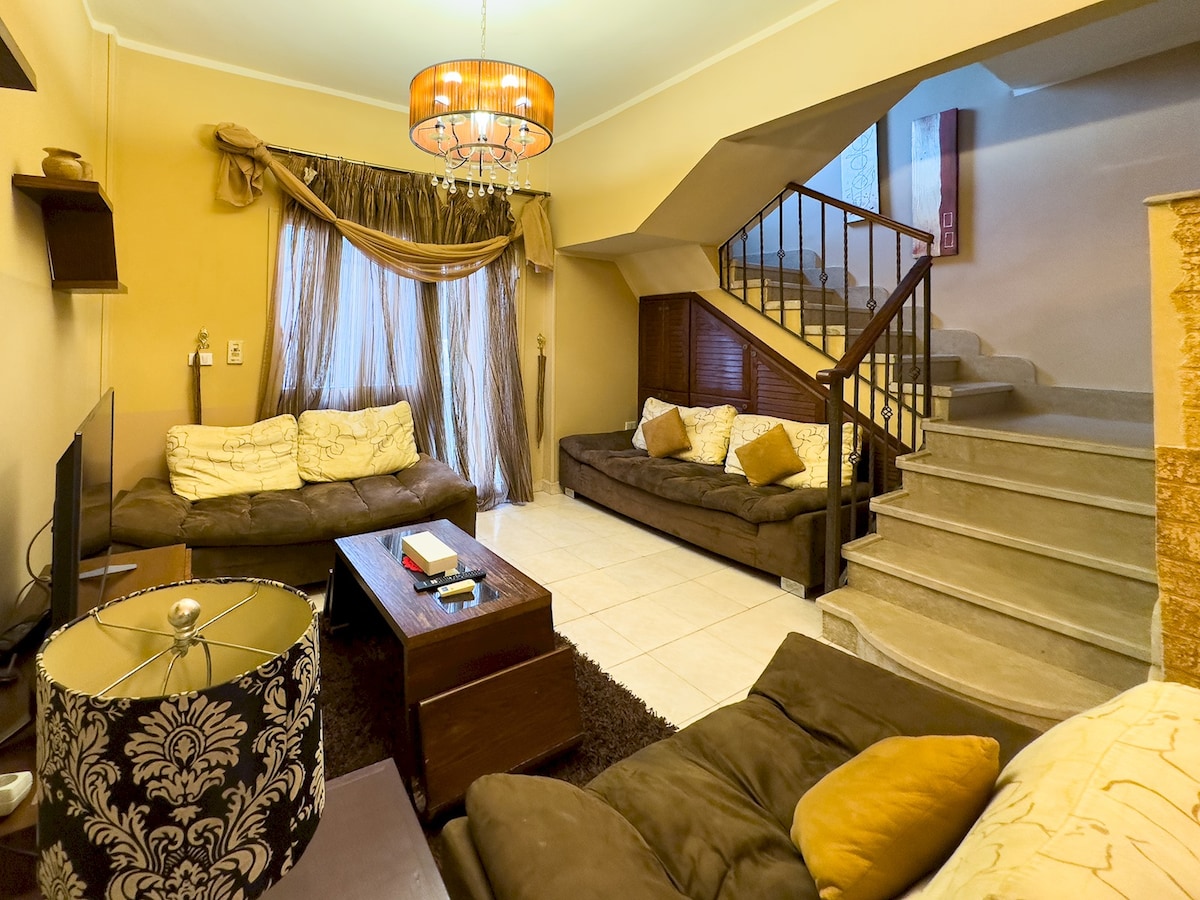 Discover our stylish 2BR townhouse in a secure gated community in Sheikh Zayed, Cairo. The ground floor features a fully equipped kitchen, a dining area, a cozy living room with a TV, and a private backyard for relaxation. Upstairs, enjoy two modern bedrooms and a bathroom. This home offers full air conditioning, fast Wi-Fi, clean towels, linens, and essentials for a hassle-free stay. Conveniently located near shops and services with easy home delivery options, it's perfect for your next trip.