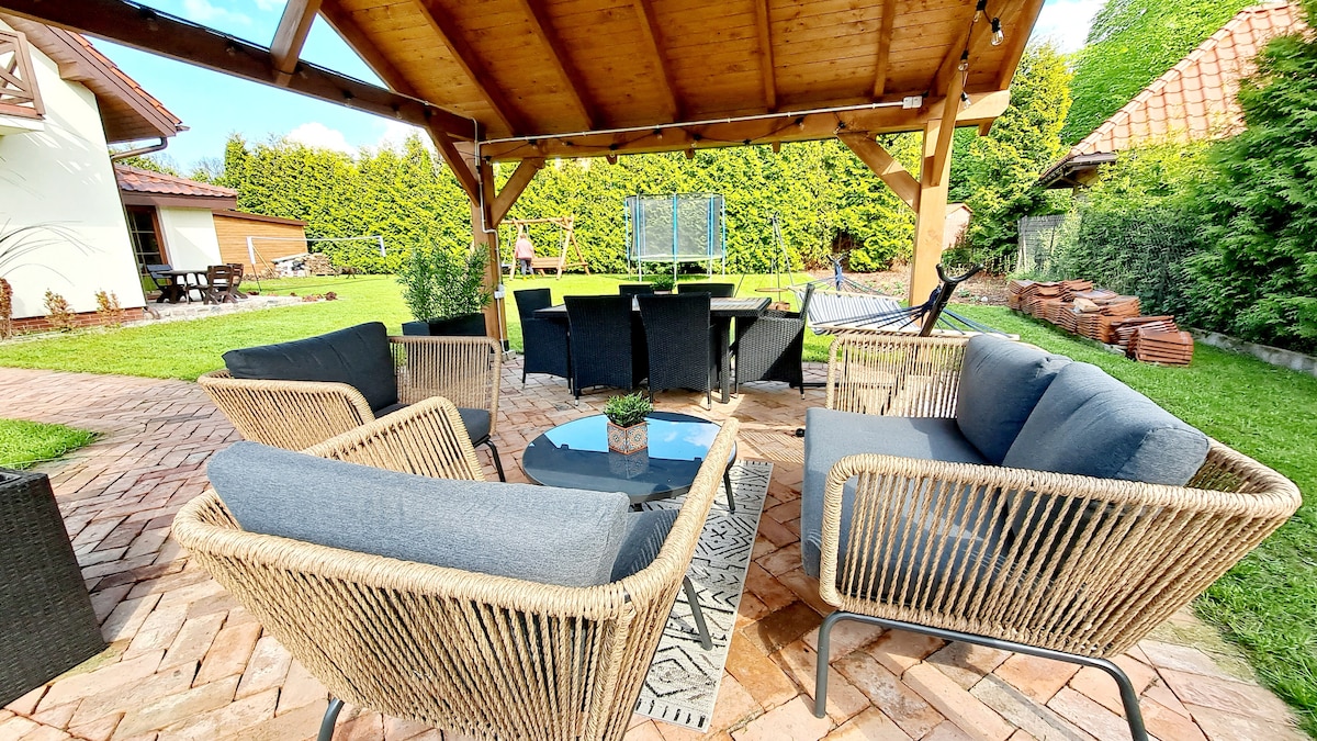 A wonderful new villa in the Mazury region built in 2019 for rent, near a beach, overlooking Tajty lake. The villa offers a comfortable luxurious relaxation. Modern equipment enables to spend your free time in a pleasant way surrounded by greenery and the lake. A comfortable relaxation is guaranteed by a garden, a sunny terrace with sun loungers, patio furniture, hammocks and a grill. Outside in the Garden you can find open all year jacuzzi and sauna for use only for guest of Villa.