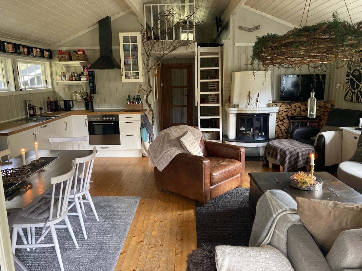 38 m²big. Whole cabin is for up to 8 people. Small children need extra supervision due to step stairs. You are surrounded by incredible and untouched nature, loneliness. The house has a common room downstairs with a kitchen, wooden oven and big table.Here you can prepare the food you need. There is a plug for power and refrigerator. And is possible to make food on a gas cooker. You have access to rowboat in wood and can fish with yarn is a fishing rod. There is bakery oven fyred with wood.