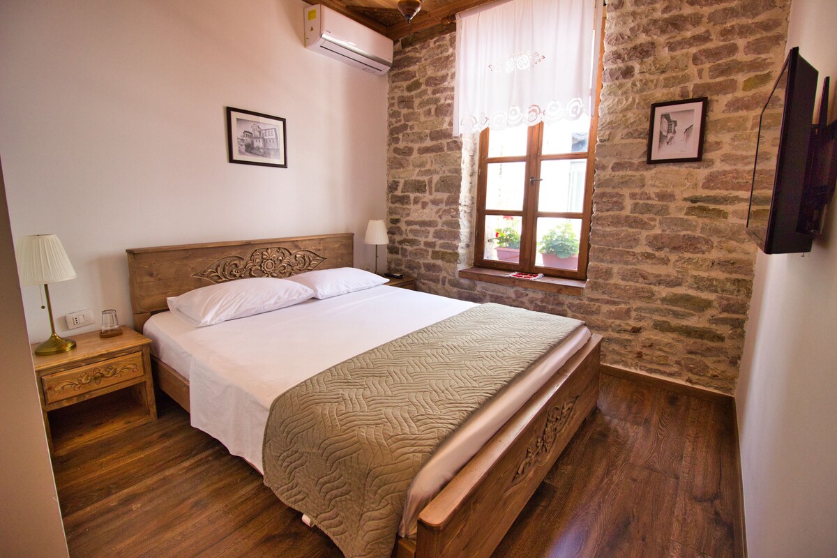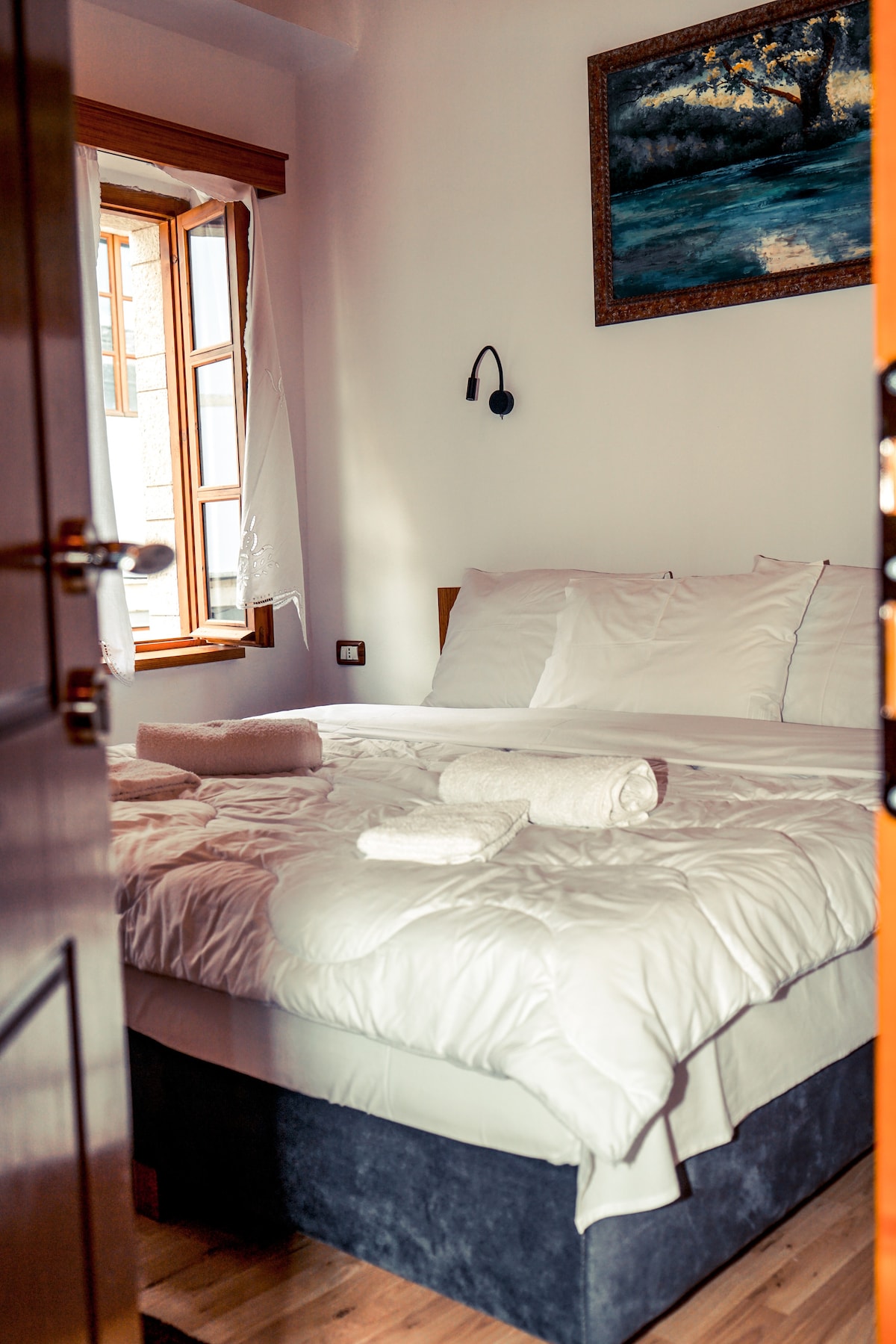 The apartment is cozy and aesthetically decorated with handcrafted ceilings, beds, and doors. We offer two available rooms, one with a double bed and the other with two twin beds. The surrounding area offers an array of amenities, including bars, pubs, shops, coffee shops, bakeries, and markets The Old Bazaar in Gjirokastra, locally known as "Qafa e Pazarit," serves as the heart of the Old Town. The history of the Bazaar dates back to the 17th century, although not much remains from that era.