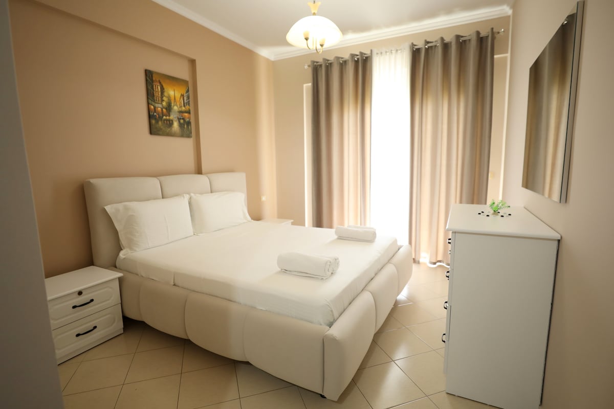 The apartment is located in Saranda, Street number 4, Lefter Talo Street, 4th floor without elevator. ~ Only 4 minutes away from the public beach”Centrali”/city promenade ~All necessary shops nearby with bigs supermarkets,restaurants,caffe,atm,gym within 5 minutes walk. ~Just 2 minutes away is a paid parking where you can park your car safely. ~Full equipped with everything necessary for long stay; 1 duble bed /1 sofa duble bed 2 A/C Balcony with stunning view of the Ionian Sea. Speed wifi