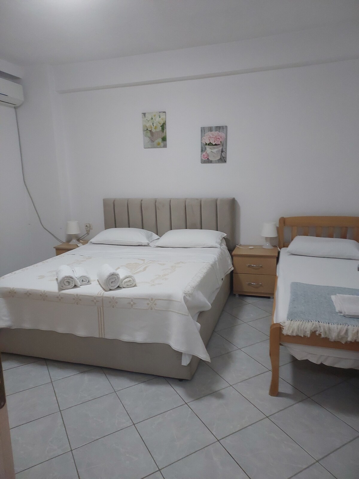 The apartment is located 5 min walk from the ferry port, 10 min walk from the center. Supermarket, beach bar's and restaurants a few steps away. Free wi-fi, air-conditioner, smart TV 32 ". The bathroom offer shower, bathrobes and free toiletries. The kitchen is equipped with a fridge, kitchenware and a stove. Free street parking. We offer transport from Sarande to Ksamil and from Tirana to Sarande.. We can help you rent a car.