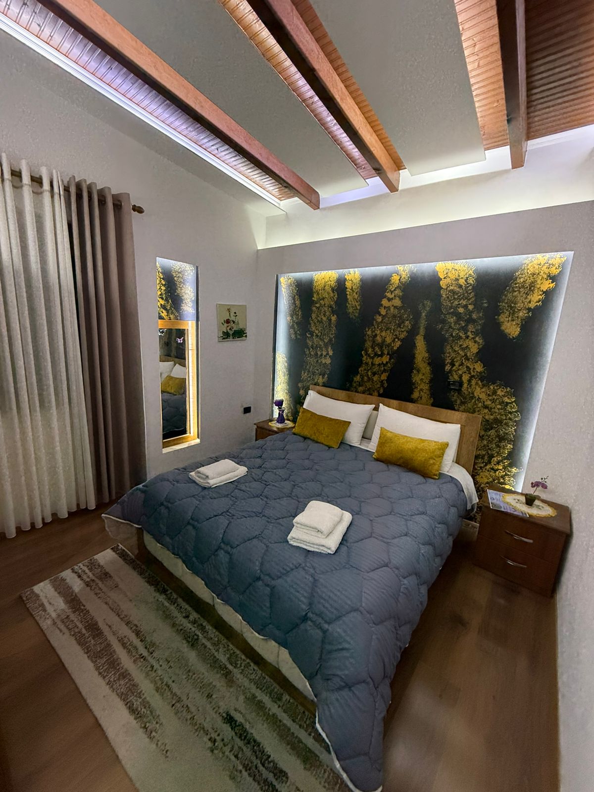 The house is located 800 meters away from the historic part of Gjirokastra, offering a stunning view of the castle and the surrounding mountains. It can accommodate up to 4 guests It consists of 2 bedrooms, a bathroom, and a fully equipped kitchen.
