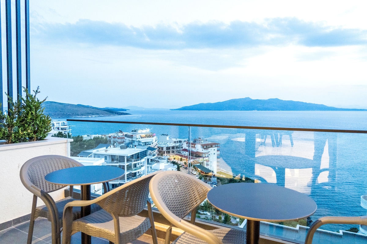 Enjoy the best views of Saranda, the Ionian Sea and Corfu. You'll have privacy and peace of quiet in a spacious apartment. It's located on the hills of Saranda in a quiet neighbourhood, yet only a 15-20 minute walk to the centre of Saranda and a 10 minute walk to the closest beach. The apartment is in a new building (2025) with pool and two balconies, including one with breathtaking views. It has a fully equipped kitchen, dining area, living room, bedroom, and bathroom with a washing machine.