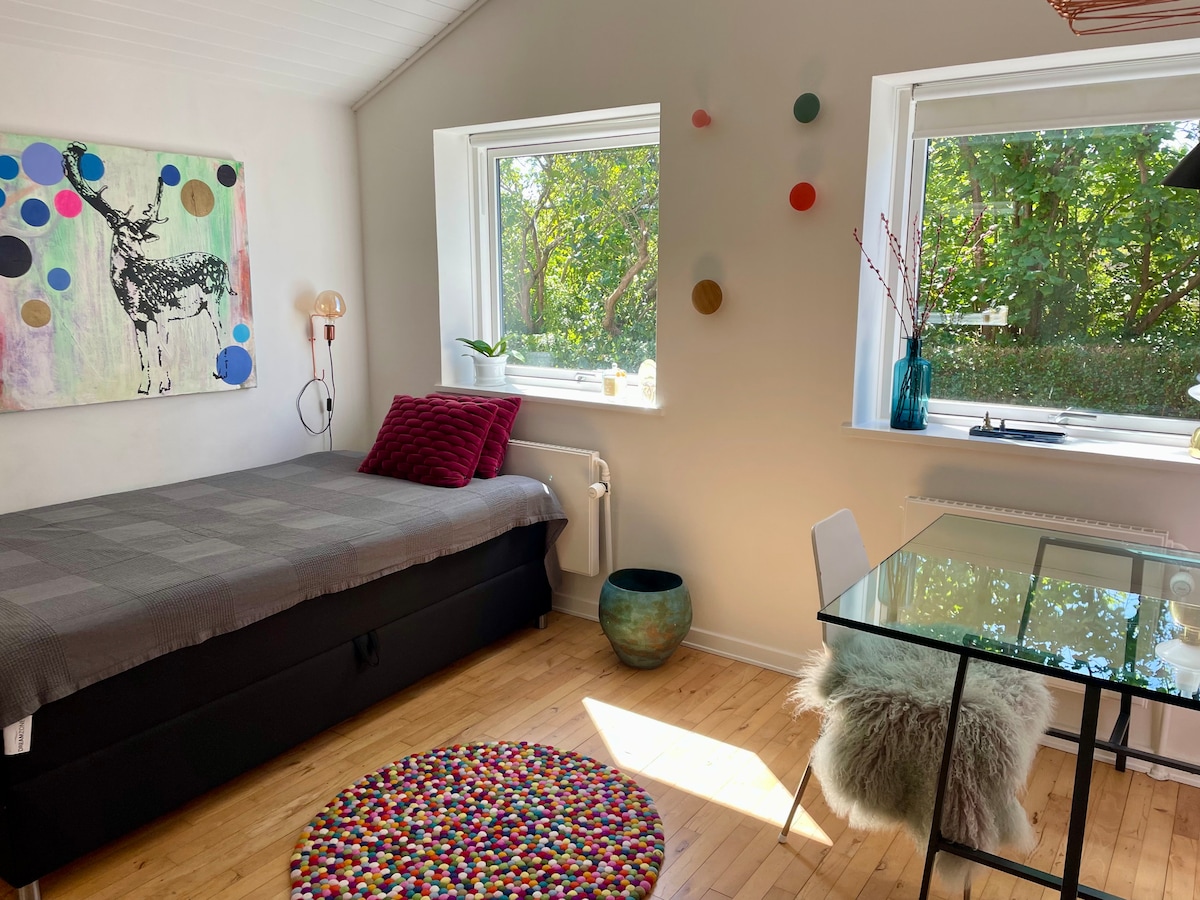 Søborg Gæstehus ligger 10 km fra Københavns Rådhusplads i fredelige omgivelser. Tag fx til Tivoli med 20 min. transport i bil - 30 min. transport i tog og på cykel. S-tog ligger 700 m. væk. Gæstehuset er helt nyistandsat og 40 kvm stort med massere af lysindfald, stille naboer, plads til madlavning, børn der leger og den enkelte der bare vil arbejde på computer og forberede næste dags arbejde i København. Værterne bor ved siden af og kan derfor let kontaktes og hjælpe med svar på spørgsmål.
