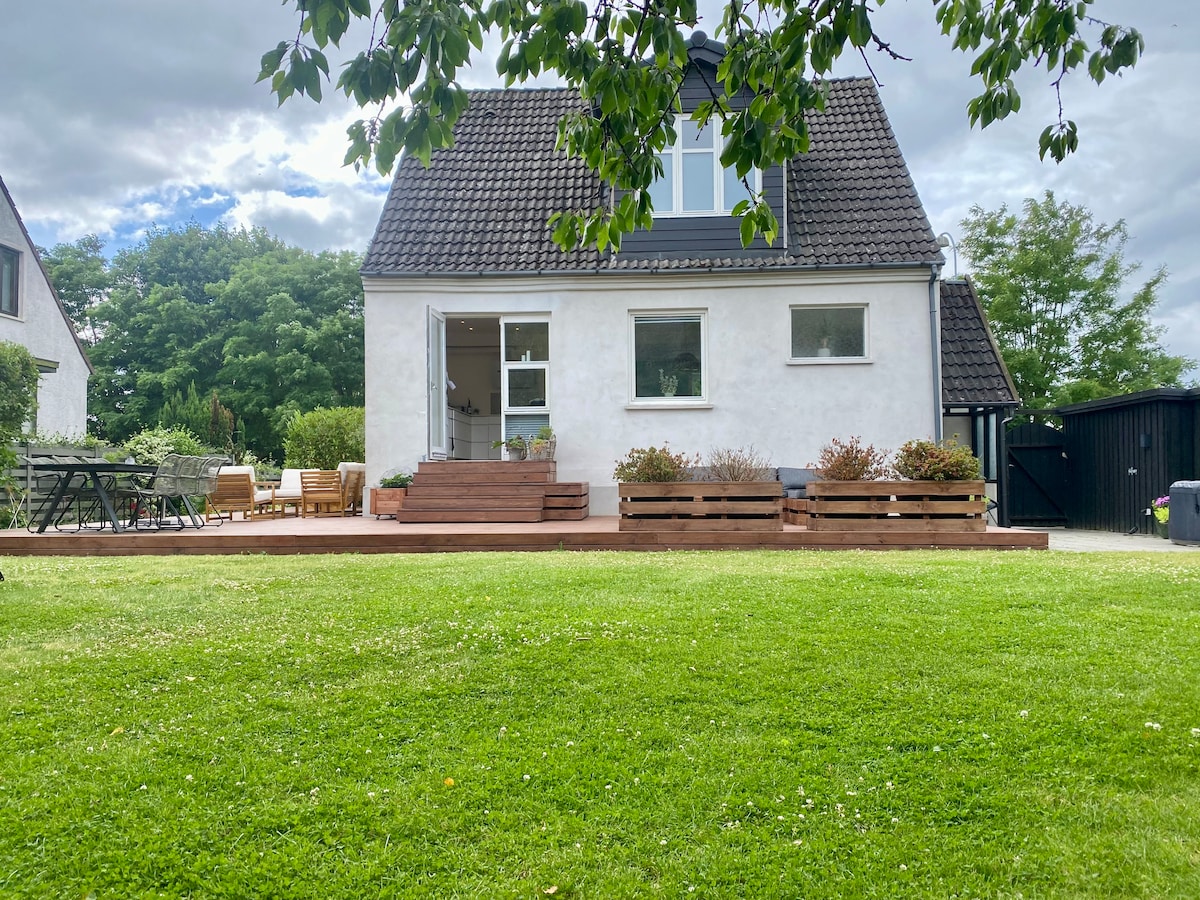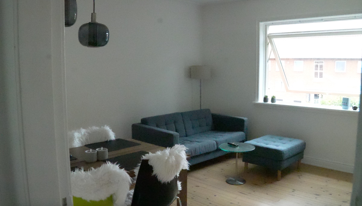 Small, bright apartment with its own terrace and small garden. Good closet space, large bathroom with shower and a good functional kitchen with oven. It is worn and older, but it is clean and cozy. There are 2 minutes to shopping, playground, McDonalds and the bus, which takes you to Nørreport station in 25 minutes. The train station 1.5 km from the apartment. In the immediate area there are also cafes and other shops. The property has many green common areas and a large free parking lot.