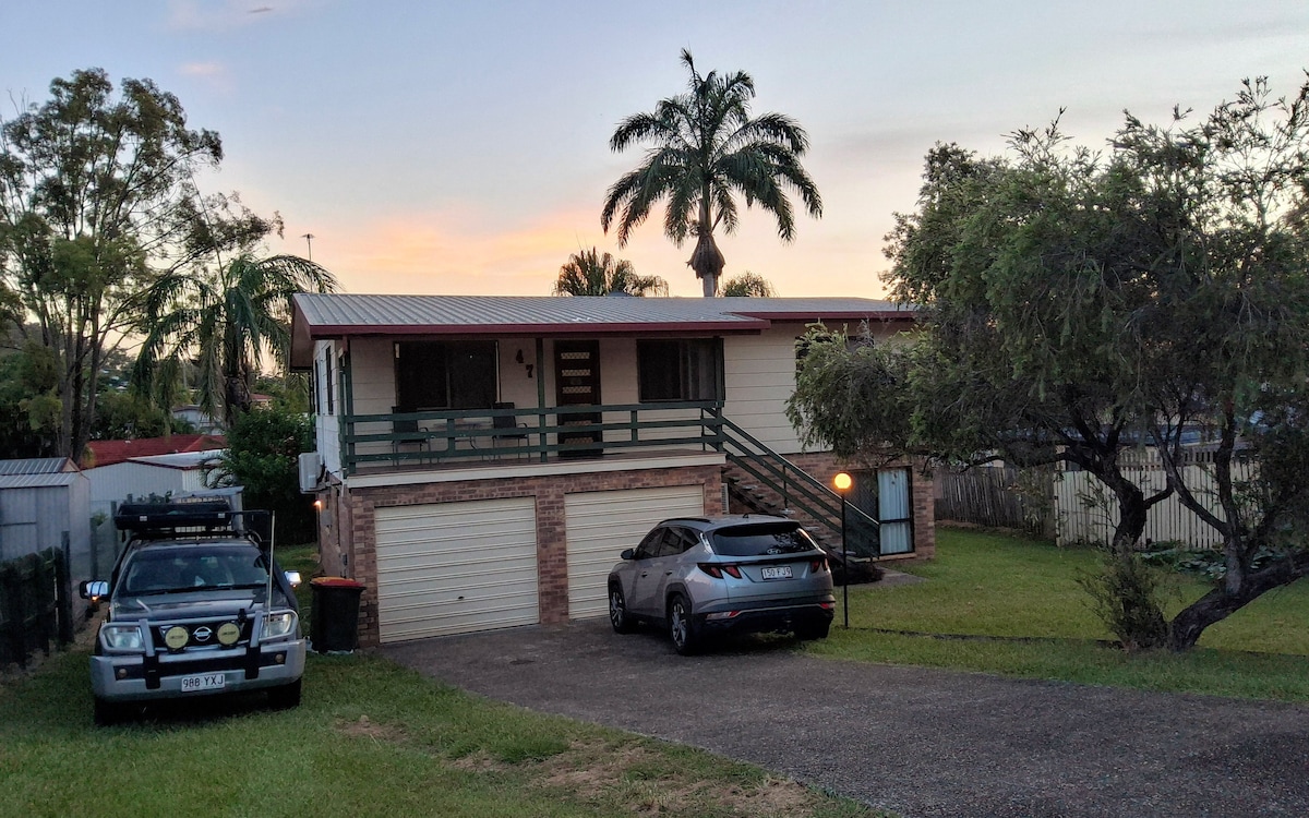 Our Queenslander split level house is situated in the heart of Gladstone, backs onto bushland & less than 5 minutes from shops. We live upstairs, the lower half is your self-contained unit - kitchen/lounge, master bedroom, ensuite and 'Beach Room' (2nd bedroom). Please note, all 4 rooms are adjoining and there is no internal walkway around the ensuite when in use, other than from outside. The Beach Room boasts the bushland view and pool which will be for your exclusive use during your stay.