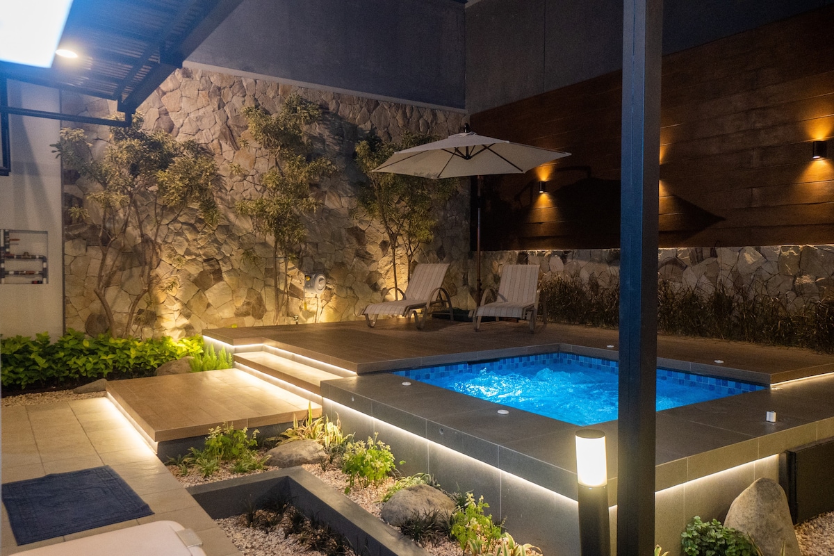 Have fun with the whole family at our stylish place. It’s a heated natural water from the hill (not a hot spring). Open from the living room, your children will love playing in this hot tub 💙 1. TIDAK available untuk pasangan yang BELUM menikah. 2. Setelah jam 10 malam kurangi volume suara dikarenakan area pemukiman. 3. Jam operasional Air Panas di kolam dari jam 6 pagi - 10 malam. 4. NO ALCOHOL, DRUGS, PORN & PARTY. 5. Security patroli 24 jam.