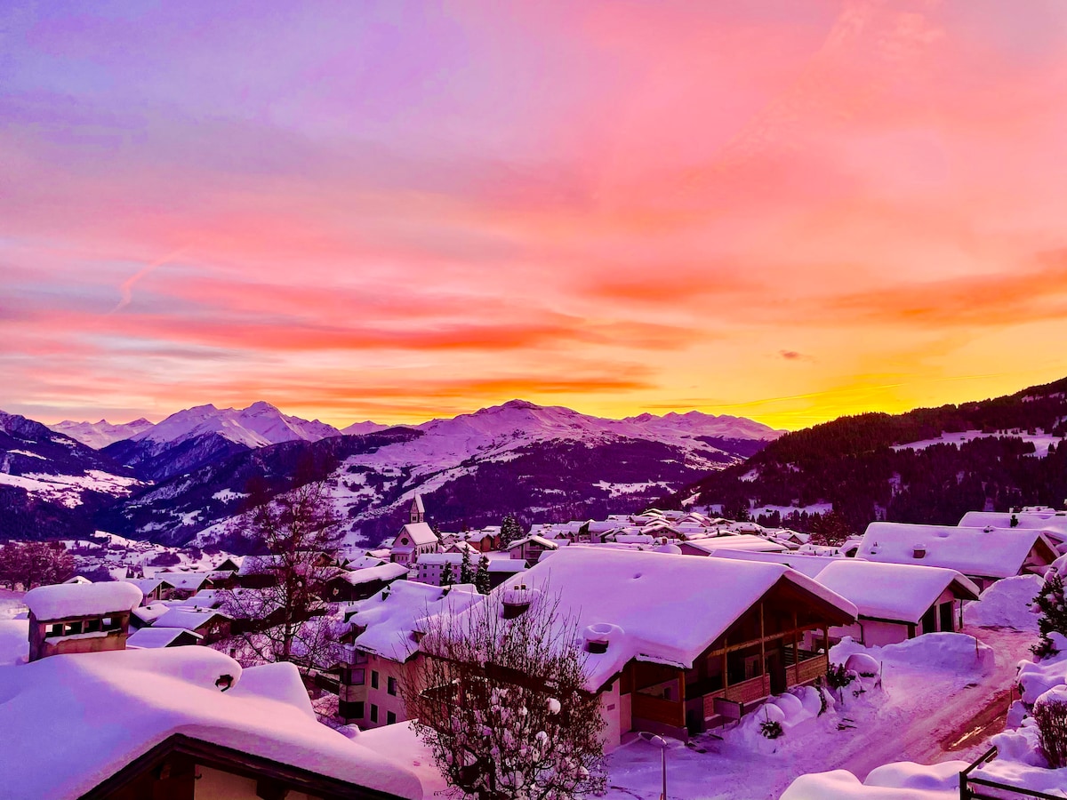 5 rooms available, about 120 m2, homy and relaxing area. Two floors and 4 bed rooms. 1 bathroom and 1 separate toilette. Bed linen and bath towels are all available and included in the price. There is a 30 m2 terrasse/platform in front of the house with an amazing view to Laax, Vally and the mountains. The house is good for couples, solo adventurers, groups and families (with kids). We have two baby beds, high chair and a basket full of toys available for families with kids. You are welcome!
