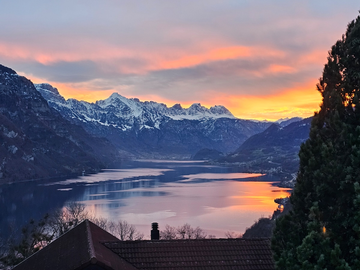 Stilvoll eingerichtetes Chalet an super schöner Wohnlage mit freier Sicht auf die Berge und den Walensee. Idealer Ausgangspunkt für Wandern, Wasseraktivitäten (Schwimmen, Kanu, Stand-up-paddle, Wind- od Kitesurfen, Segeln), nahe an Kletterfelsen/ Indooranlage. Ski- und Wintersportregion: 15min by car, Flumserberge. Schlitteln im Dorf (Habergschwend) Ideal um zur Ruhe zu kommen. Für Firmen u/o Geschäftsreisende bieten wir eine ruhige Oase um frische Energie zu tanken o Meetings
