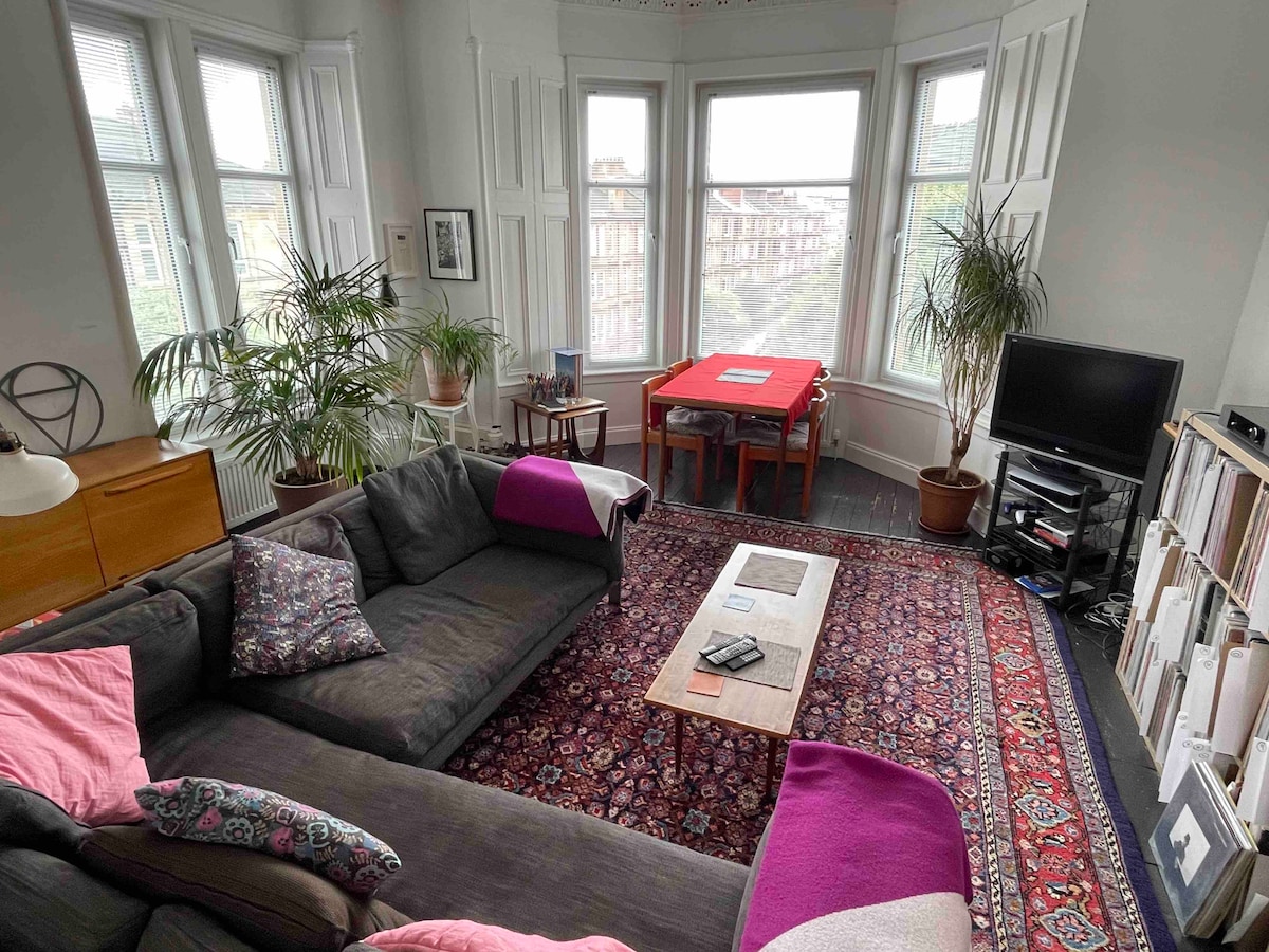 Our beautiful flat in the West End is a walk away from Glasgow Uni, the botanical gardens, Byres Road & Ashton Lane. It’s right by Hyndland train station, getting you to the SEC in 5 mins or city centre in 10. Bus and subway links also great. It’s a quiet, leafy street with a lovely wee cafe on the corner but only a short stumble away from Partick’s legendary pubs, Hyndland’s fancy brunch spots, plus shops, supermarkets & restaurants for all budgets /tastes! (Alas, no free parking on our street)