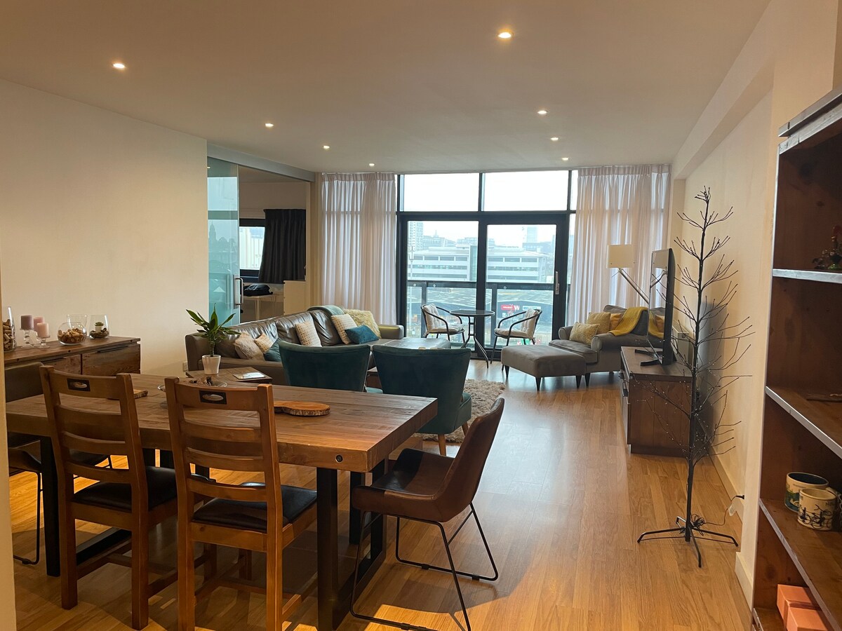 This luxurious penthouse in Glasgow's West End is under 10 mins walk from the Ovo Hydro / SECC. It’s a perfect choice for concert-goers, event attendees, Commonwealth Games 2026, or anyone visiting Glasgow. Directly opposite the large Nuffield Health Gym, there's also Exhibition Centre station nearby which has trains every 10 mins to city centre. There's also secured parking. It's a really beautiful, modern and very spacious place that we love living in, and are sure you will too. Have fun!