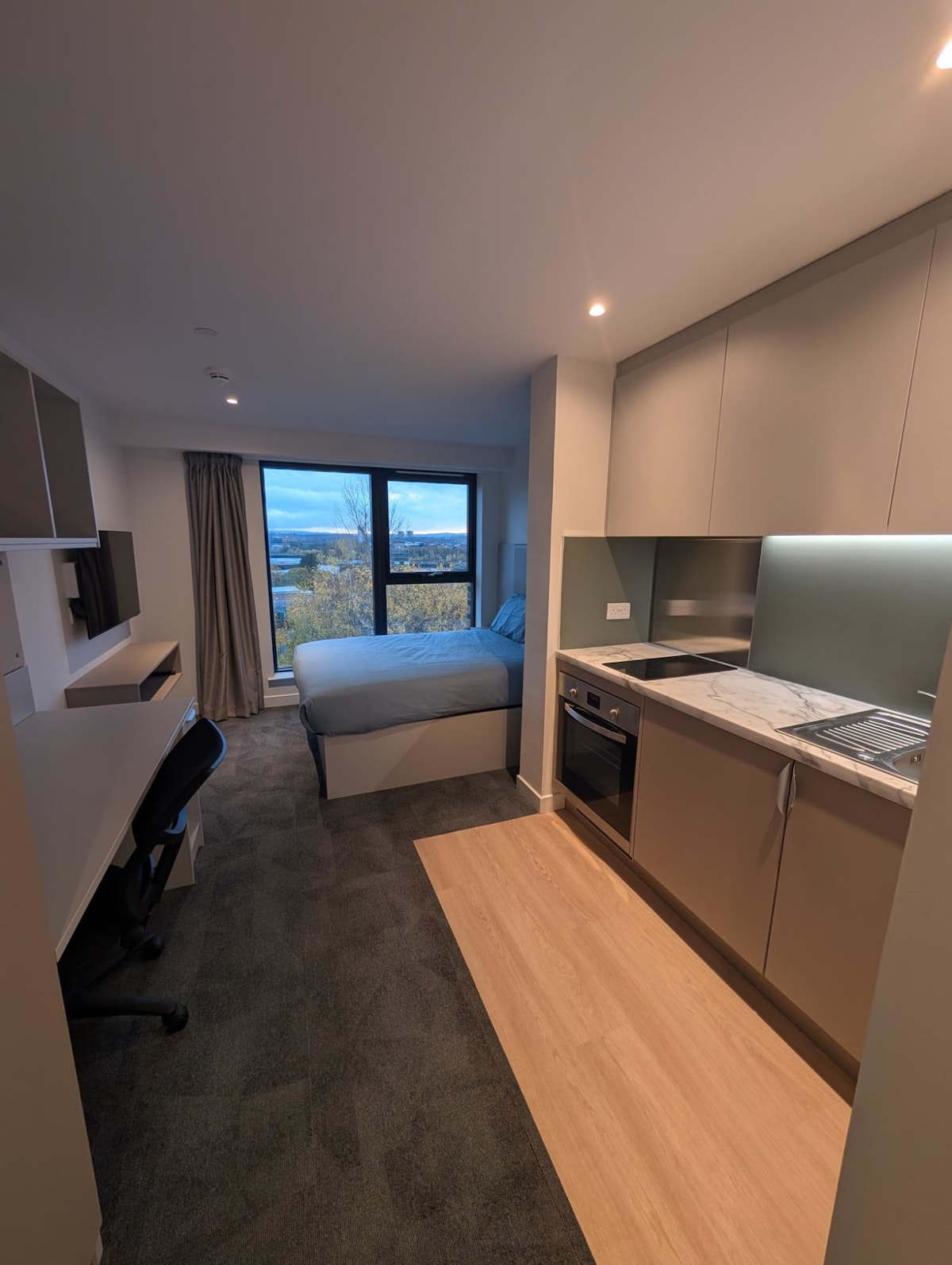 🌟 Experience the ultimate in student living with our modern studios, located in the vibrant heart of Glasgow. Our thoughtfully designed studios offer everything you need for a comfortable and productive stay, featuring a cosy small double bed, a self-contained kitchen, and a private bathroom. Each studio also includes a dedicated desk for your study needs, ensuring you have the perfect space to focus and excel.